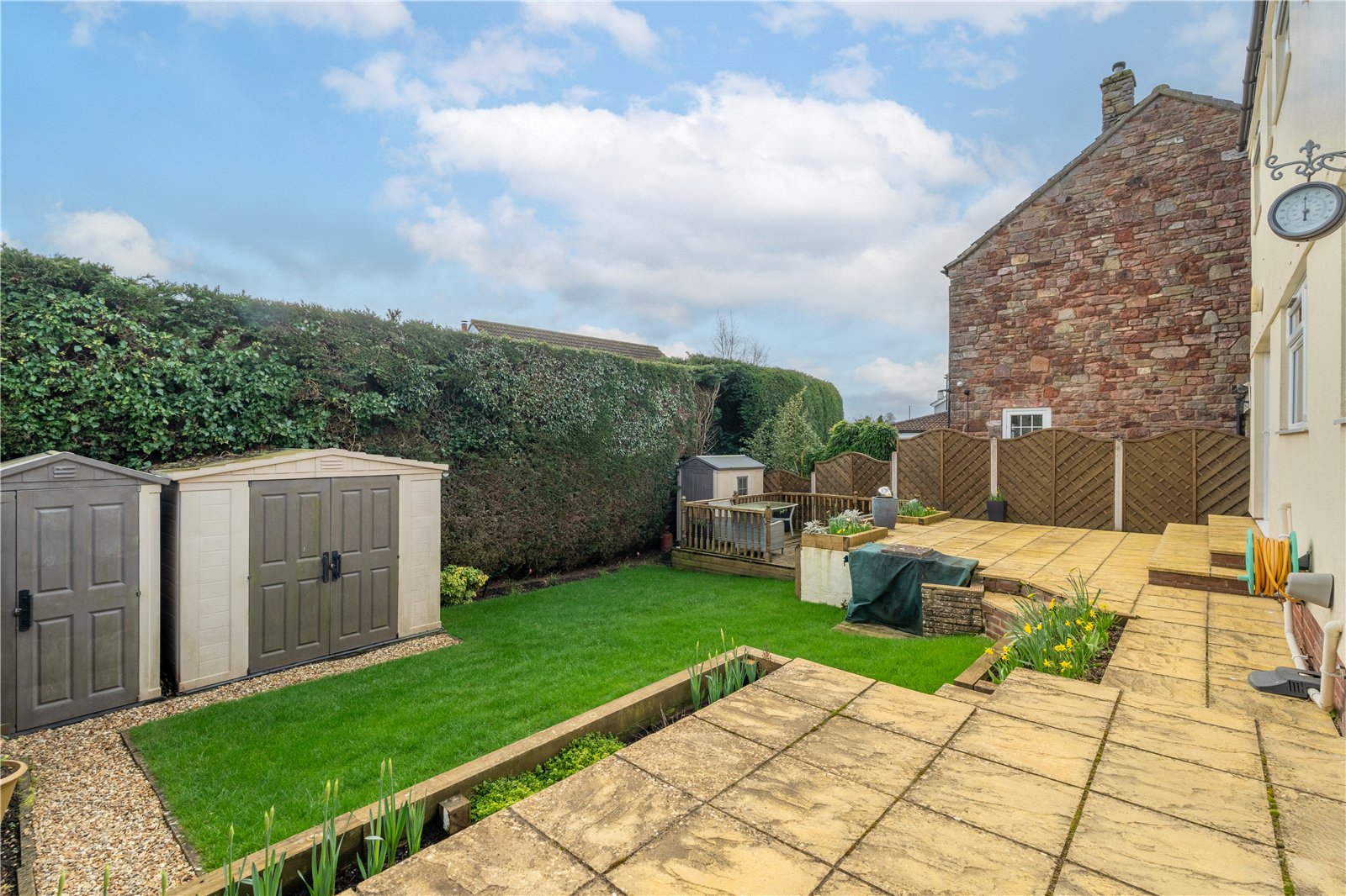 To the front, the property is approached via a private driveway providing ample off-road parking, along with a single garage. The rear garden is a particular highlight, offering a large, private outdoor space complemented by a wrap-around patio, ideal for entertaining, outdoor dining, and family enjoyment.