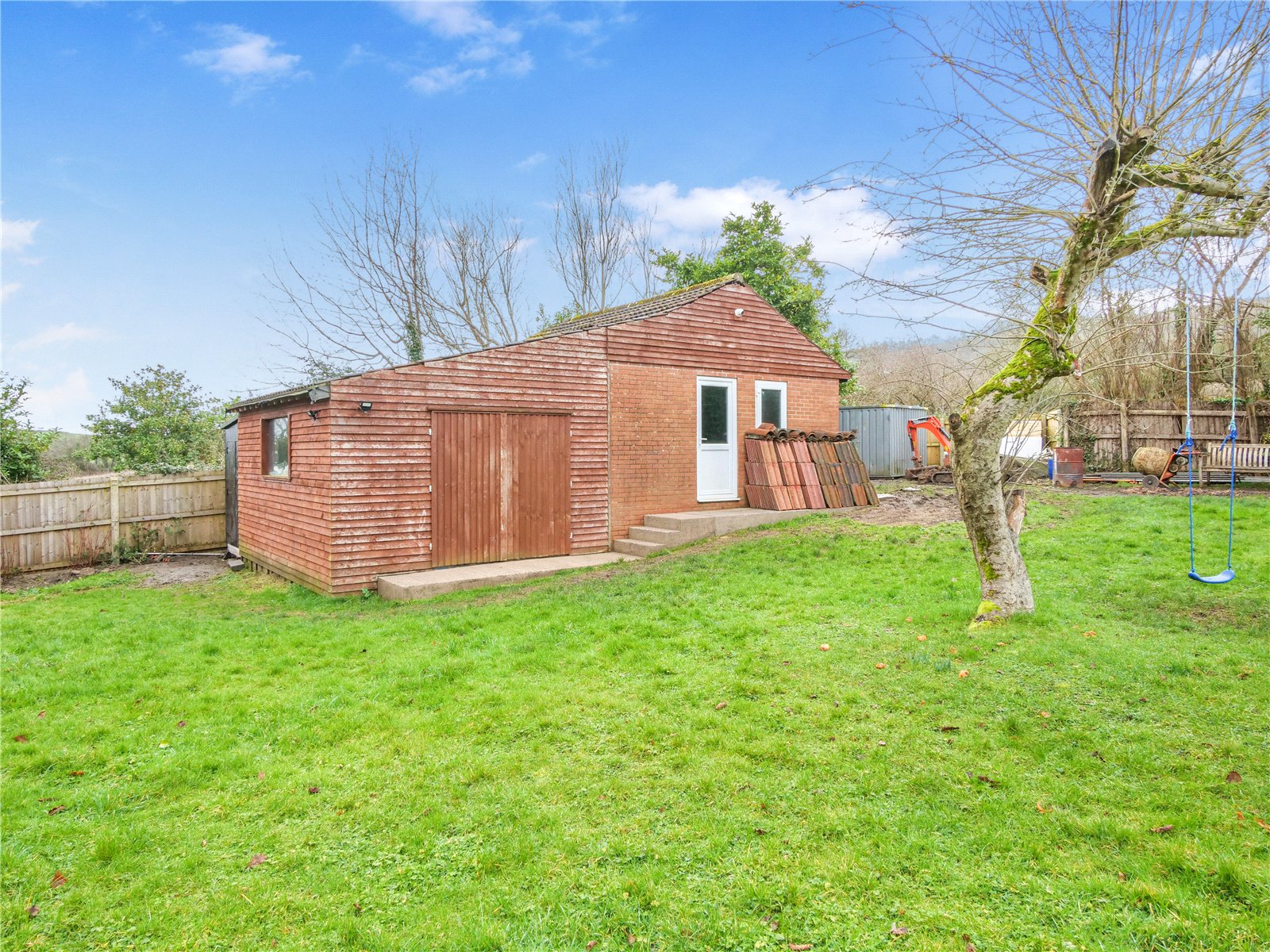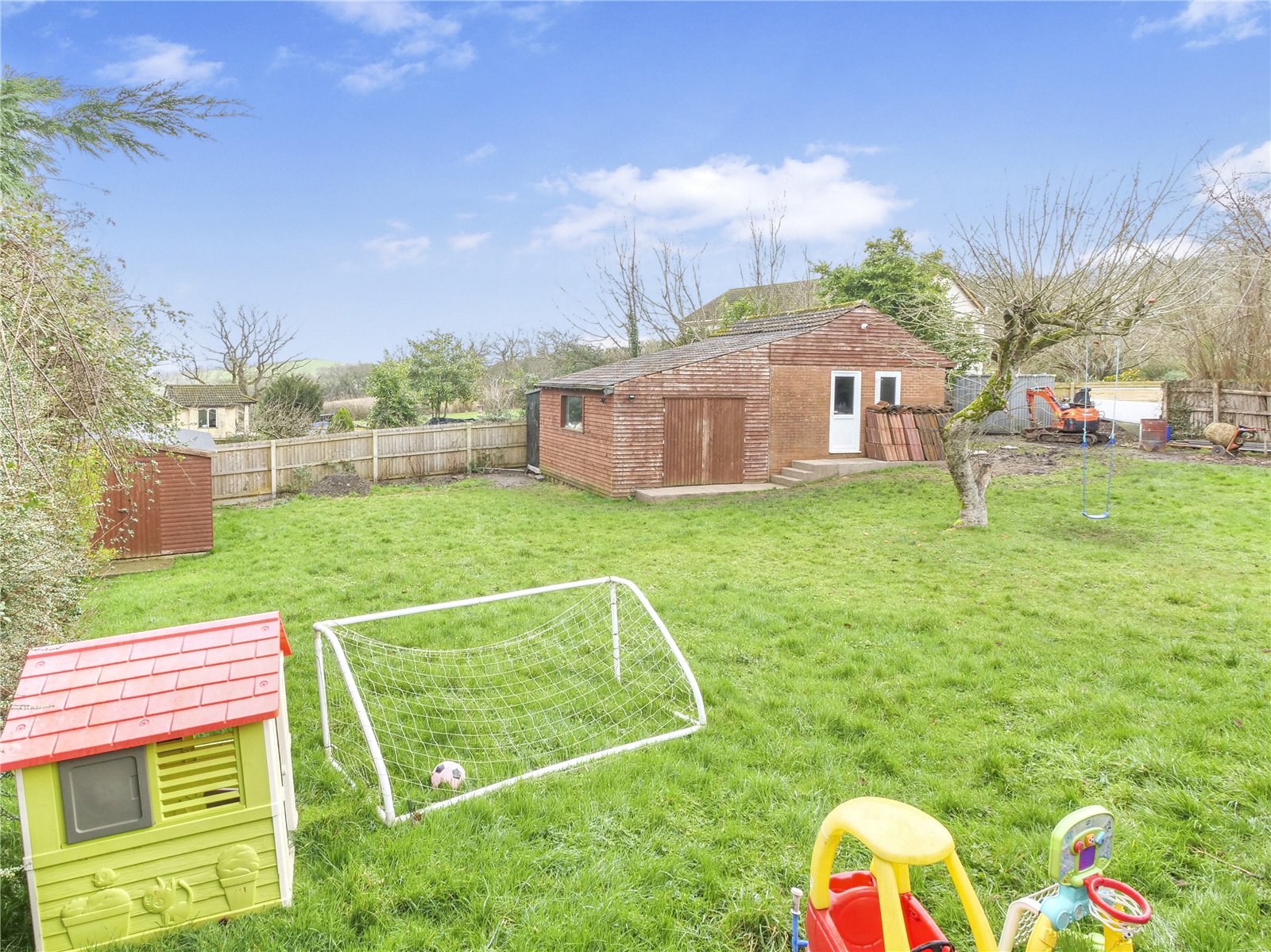 The generous garden enjoys sweeping views across the surrounding hills, with glimpses of the reservoir from the upstairs bedroom. Additional outbuildings include multiple sheds and a substantial workshop, while an electric gate provides secure access to extensive private parking and the double garage.
