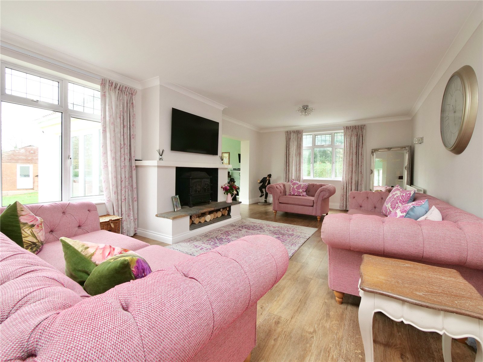 To the front of the property, a beautifully presented guest bedroom, alternatively perfect as a third reception room, features a contemporary fireplace and stylish decor. The elegant main living room is an inviting dual aspect space with wood flooring and a charming wood burning stove. An archway leads seamlessly into a bright and airy garden room with vaulted ceilings and French doors opening directly onto the garden.