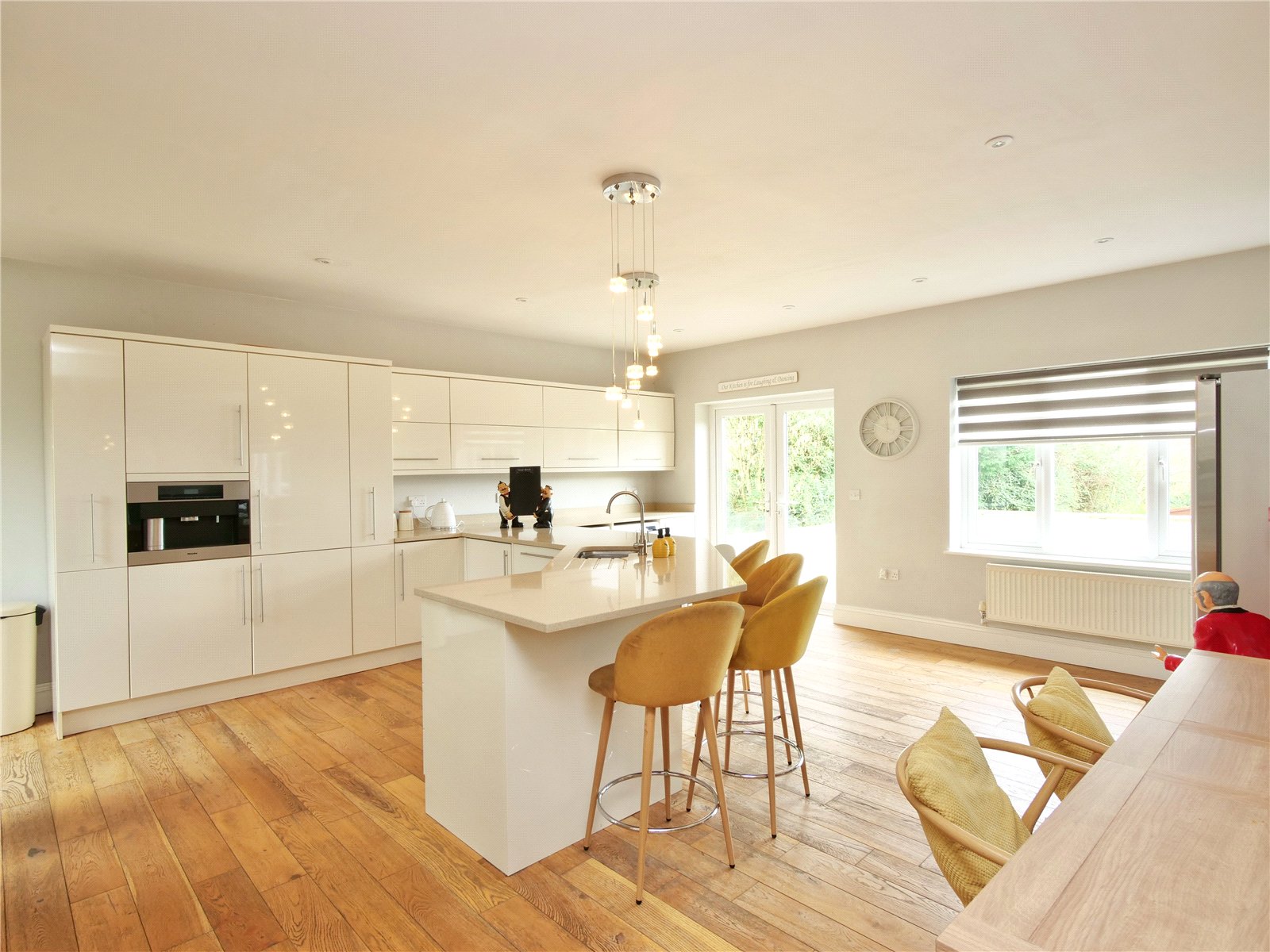The impressive kitchen/dining room is the heart of the home. Designed with both family life and entertaining in mind, it incorporates a relaxed family seating area at one end, and a sleek, modern kitchen at the other. Highlights include a curved breakfast bar, gas range cooker and French doors opening onto a generous paved terrace overlooking the garden and rolling hills beyond. The principal bedroom enjoys a peaceful outlook and enjoys an en-suite shower room. A spacious family bathroom with a separate shower completes the ground floor accommodation.