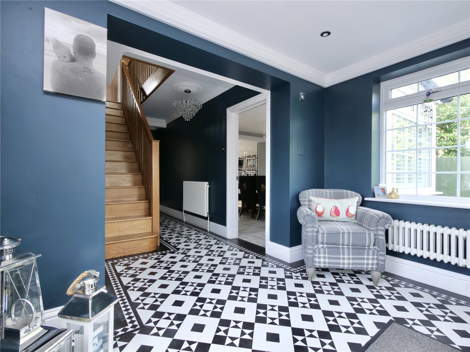 The ground floor welcomes you with a spacious tiled entrance hall leading into a showstopping open-plan kitchen/dining room. A vast central island under elegant chandeliers forms the heart of the home, complemented by tri-fold doors that open seamlessly onto the pool and garden. A square bay window adds charm to the dining area, while a cosy front sitting room and a larger rear living roomboth with contemporary feature fireplacesoffer ideal spaces to relax.