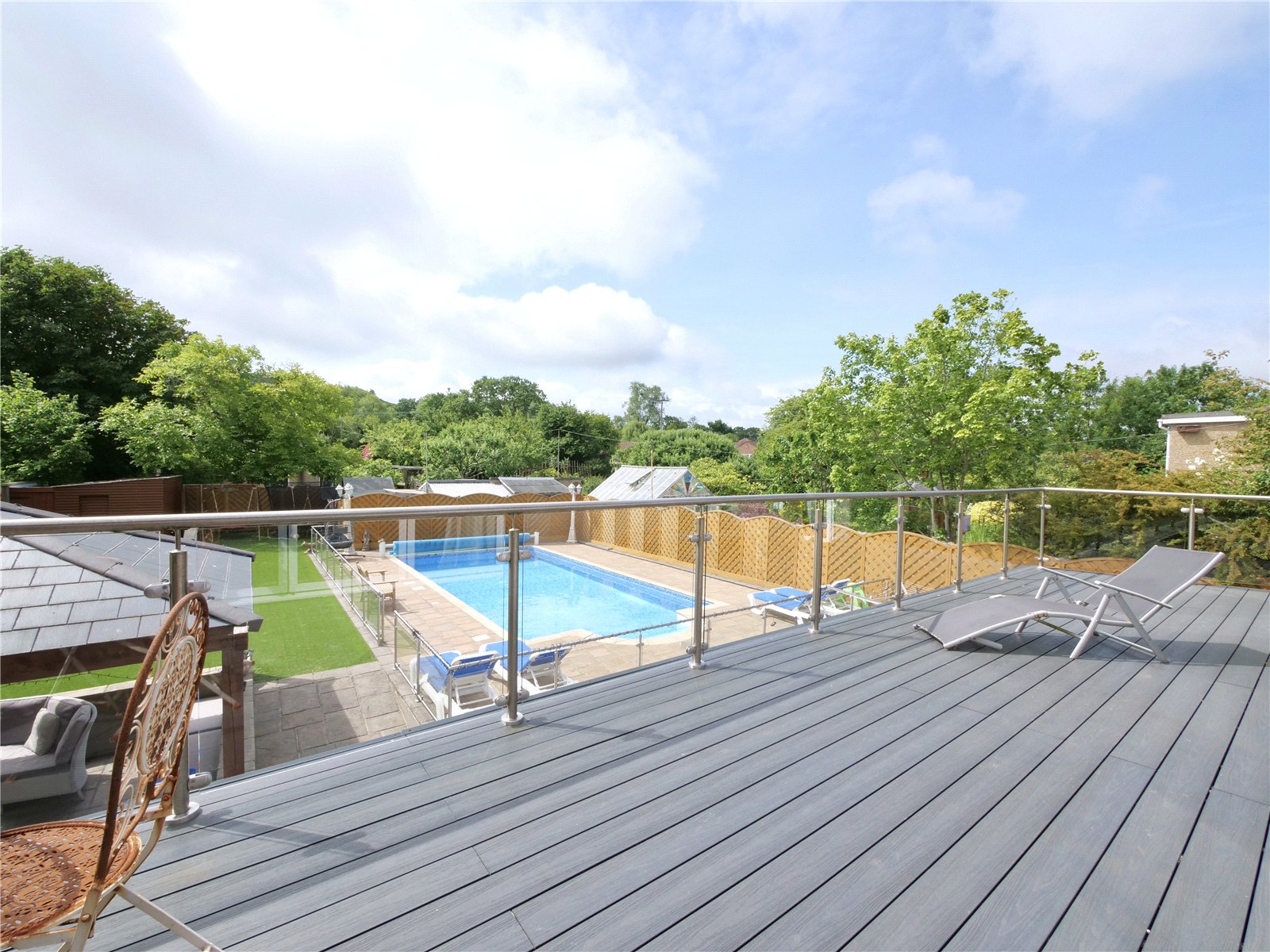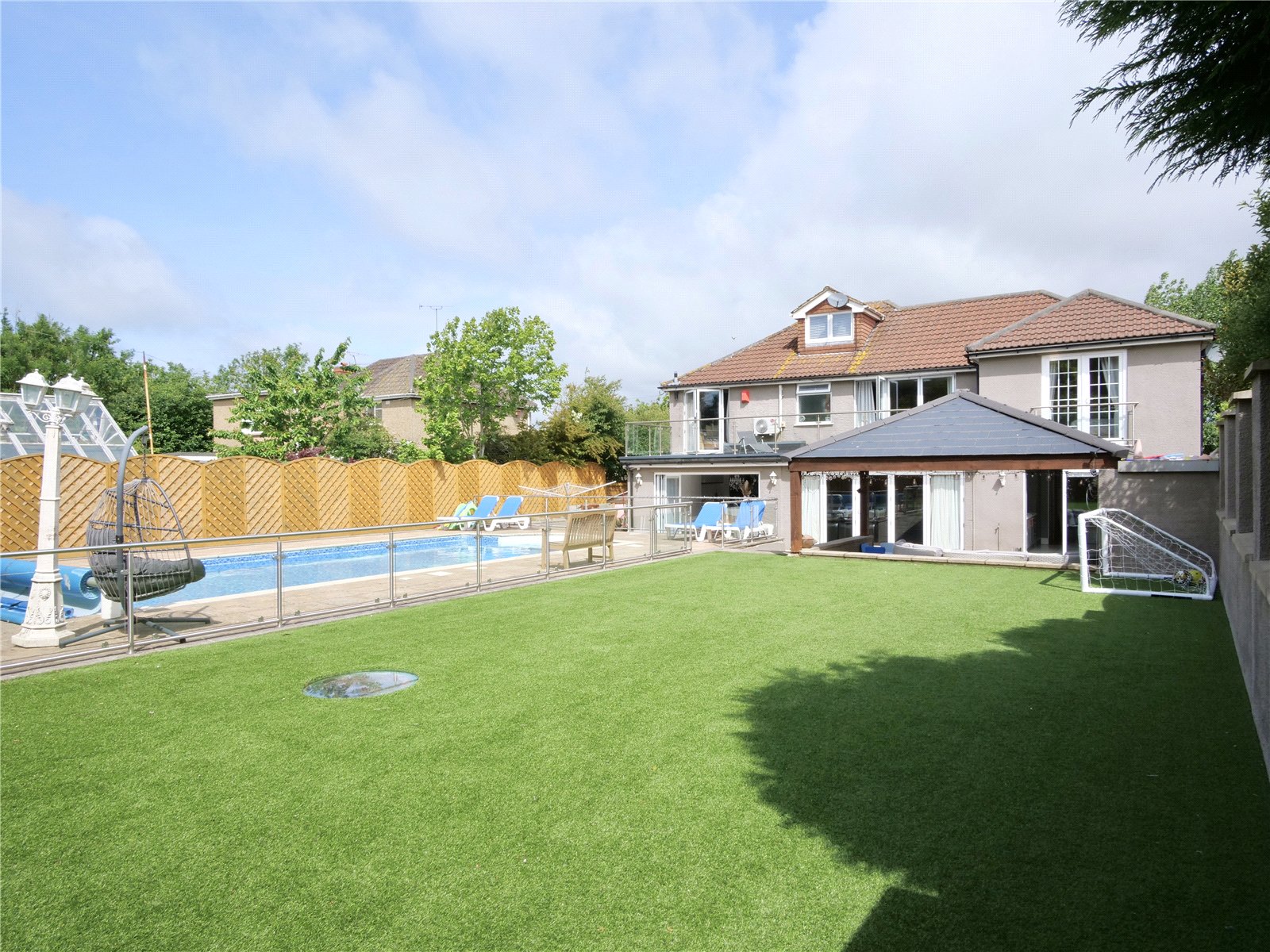 Perfect for entertaining, the generous rear garden features a low-maintenance artificial lawn, a wide sun terrace, and a large swimming pool framed by glass safety fencing. An outdoor kitchen and covered seating area with lighting and heating extend your living space throughout the seasons. The entire garden is designed for ease and enjoyment.