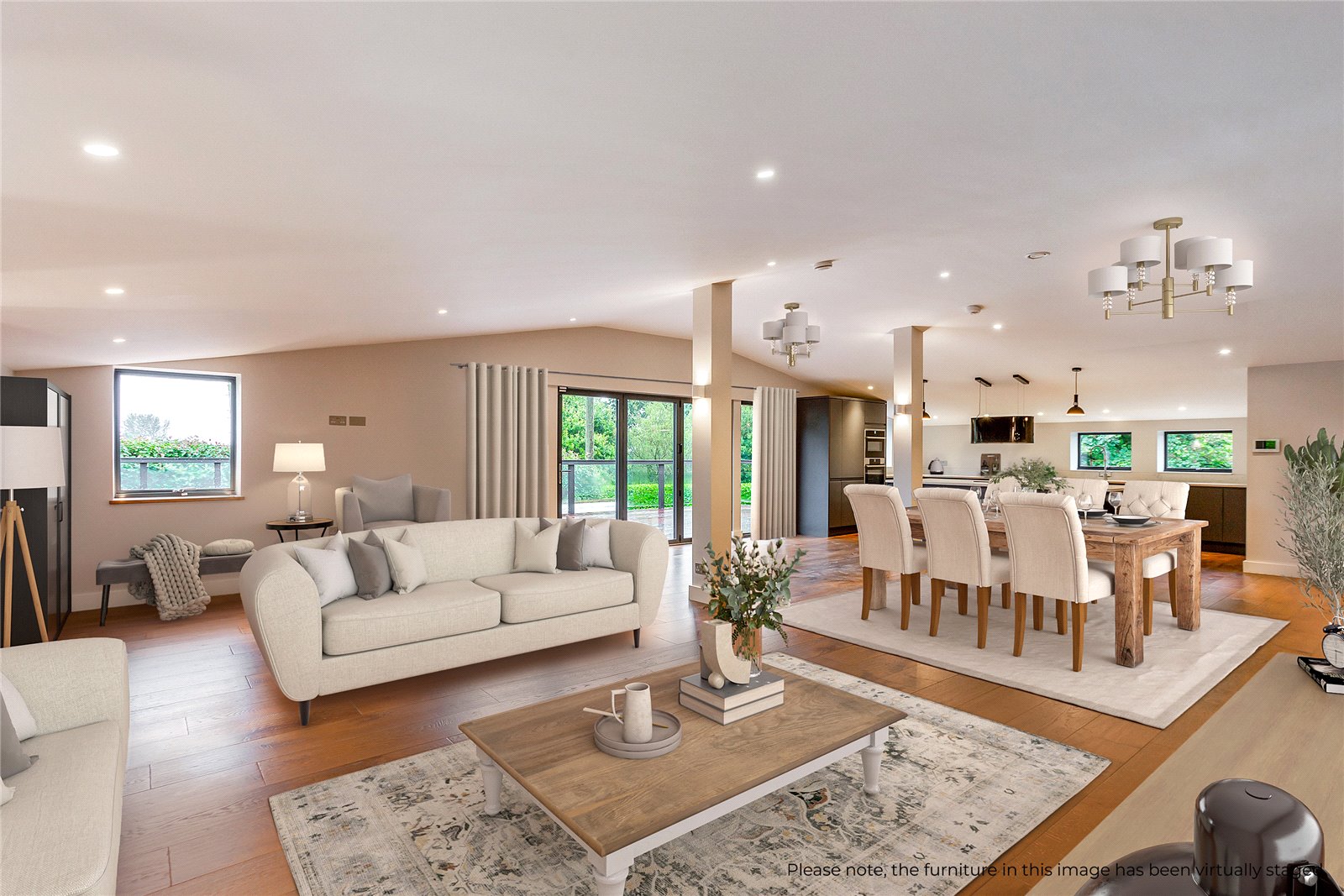 Connected yet self-contained, the annexe offers its own entrance and comprises a spacious contemporary open-plan kitchen/living room on the ground floor with bi-fold doors opening to the garden. Upstairs, three comfortable double bedrooms and a family bathroom provide ample accommodation. The principal bedroom features a Juliet balcony with views across the pool.