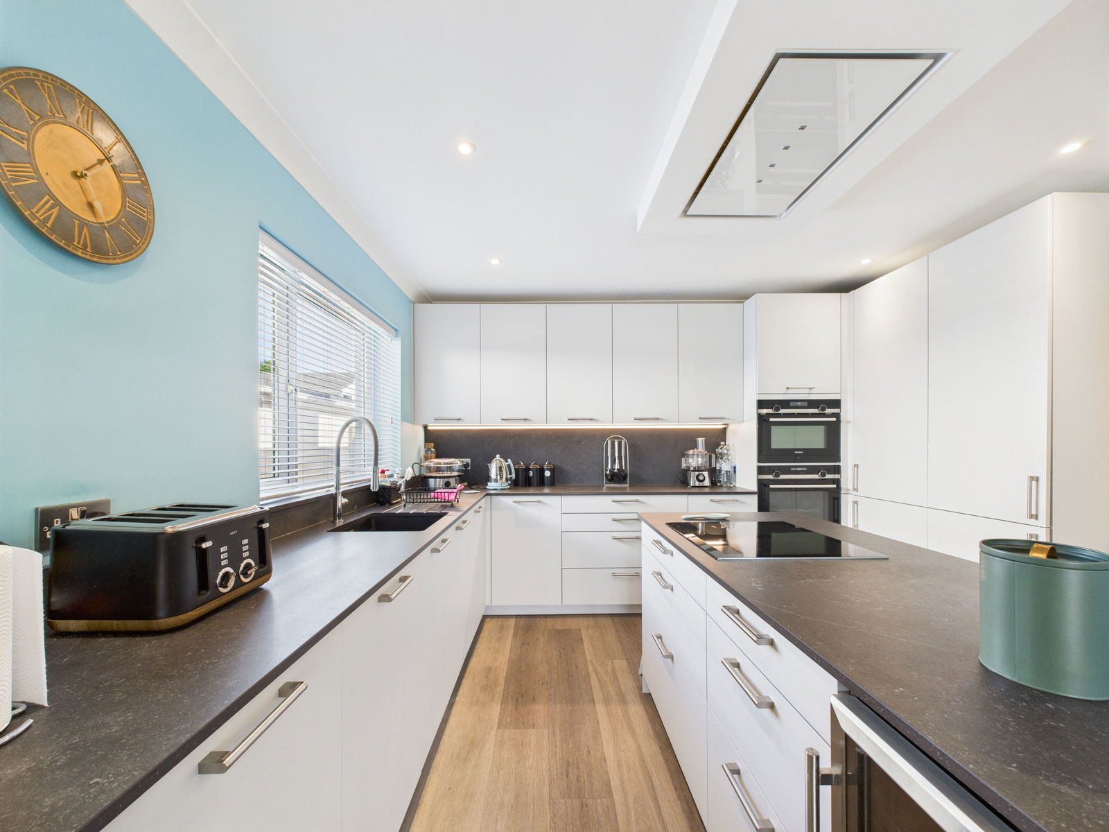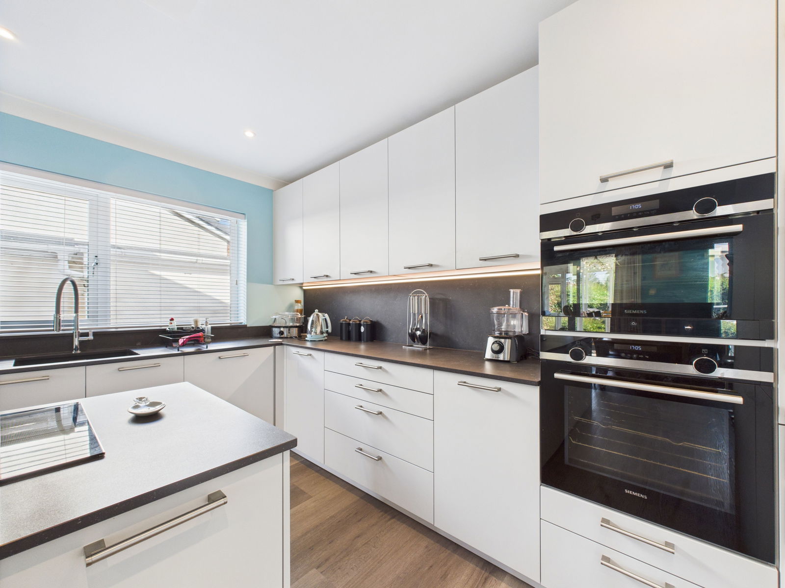 KITCHEN/DINER A recently installed, high specification kitchen/diner designed with both style and functionality in mind. Featuring a wide range of sleek overhead, base and drawer units complemented by square edged work surfaces. Includes a 1 bowl sink with mixer tap, integrated eye level electric double oven with grill and microwave, a central kitchen island housing an induction hob with extractor above, and further storage beneath. Additional integrated appliances include a fridge, freezer, dishwasher, washing machine, and wine cooler. The room comfortably accommodates an 8 seater dining table with natural light streaming through double aspect uPVC windows and French doors opening into the sunroom.