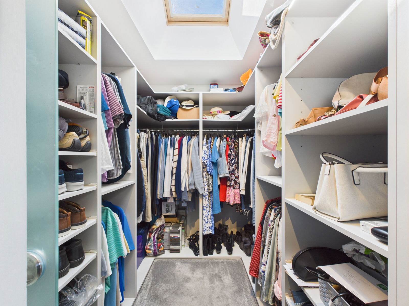 BEDROOM ONE A luxurious and spacious master bedroom overlooking the manicured rear garden. Offers ample space for freestanding furniture, a large uPVC double glazed window, and a gas central heated radiator. A contemporary sliding frosted glass door reveals a walk in wardrobe fully fitted with shelves, drawers, and hanging space, complete with a skylight for natural light.