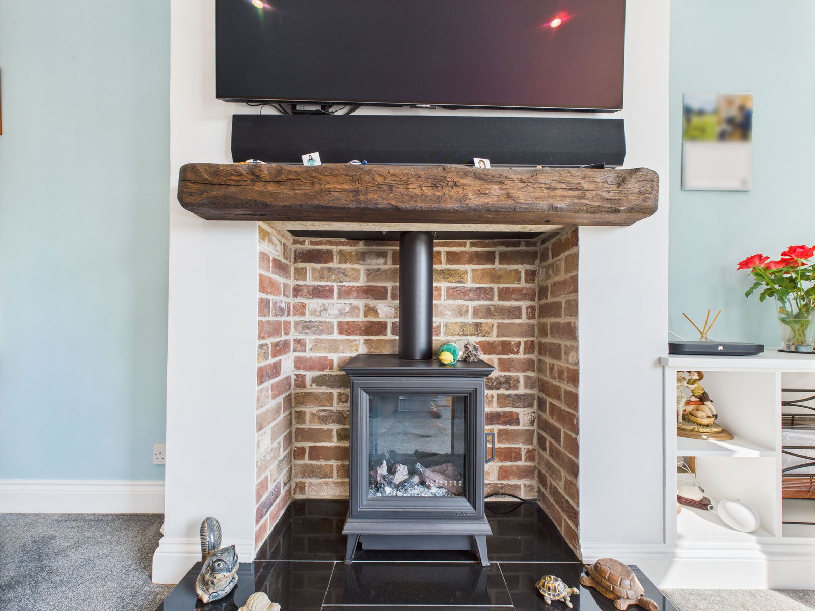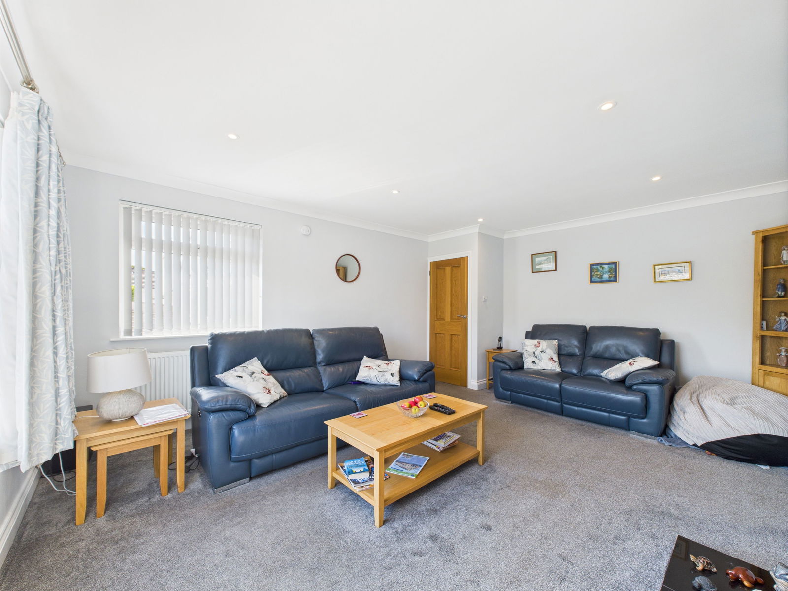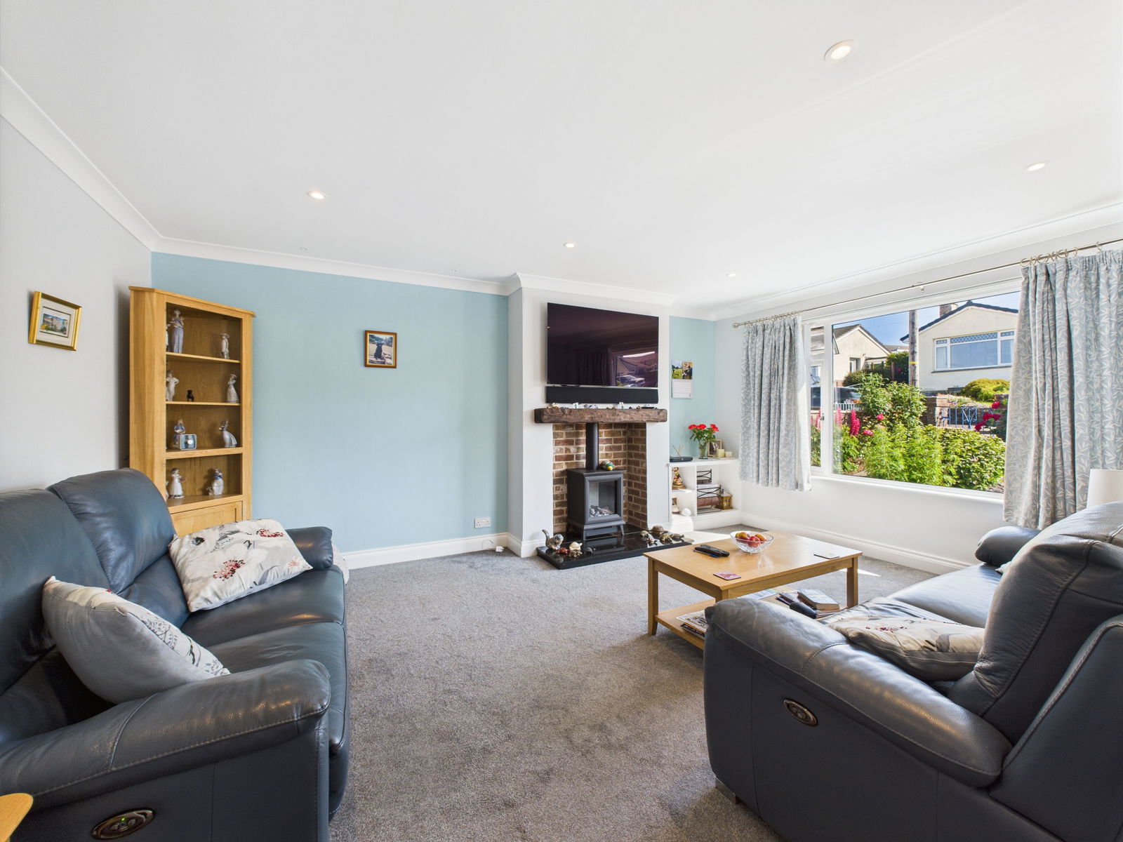 LIVING ROOM An impressively bright and generously proportioned living space, enjoying dual aspect uPVC double glazed windows that flood the room with natural light. A charming electric fireplace with a solid wood mantle, complemented by a gas central heated radiator.