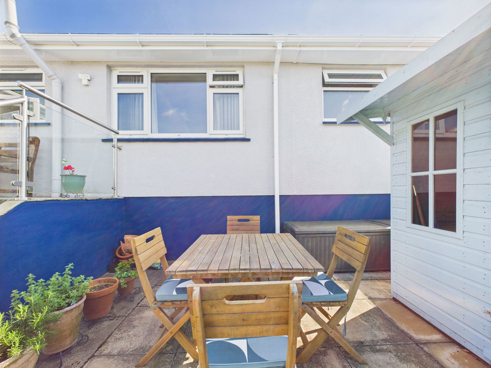 EXTERIOR To the rear, the landscaped garden has been cleverly designed for minimal maintenance and maximum enjoyment. A raised patio with stylish glass balustrade offers the perfect setting for outdoor dining and entertaining. Steps lead down to a generous artificial lawn area, two additional patios, and a charming summer house. Further benefits include a timber storage shed, under house storage and side access.