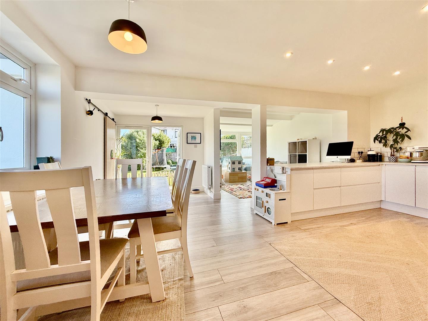 On the ground floor, the living spaces are light-filled and inviting. The main lounge features a large bay window framing the beautiful outlook, while a cosy second sitting room/snug at the rear opens directly onto the south-facing garden. The heart of the home is the spacious kitchen-diner, newly fitted with integrated appliances and a large breakfast bar, offering ample space for family gatherings and entertaining.