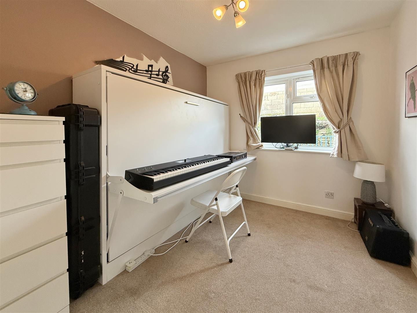 There is ample built-in storage accessed from the hallway, and both bedrooms are positioned at the rear, offering a good level of privacy. The rear garden is accessed from the main bedroom. The second bedroom includes a handy fold-down combined double bed and workstation, making it ideal for those requiring a home office or study while still retaining the option to accommodate guests.