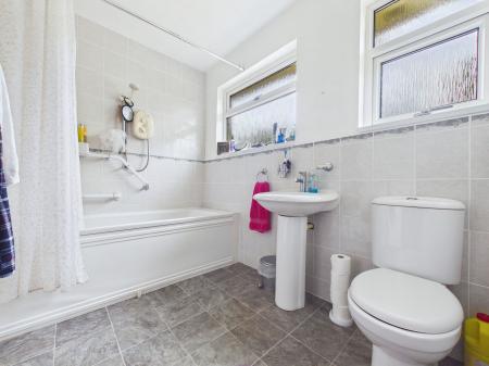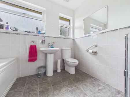BATHROOM Modern white suite comprising panelled bath with electric shower over, pedestal wash hand basin, low level WC and mostly tiled. uPVC double glazing.