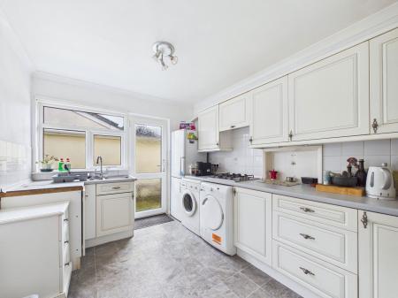 KITCHEN - 3.7m x 2.7m (12'1" x 8'10") Range of fitted white fronted wall units comprising a single drainer sink unit and cupboards below. Adjoining comprehensive range of wall and base units. Inset gas hob. uPVC double glazing. uPVC double glazed door to rear.