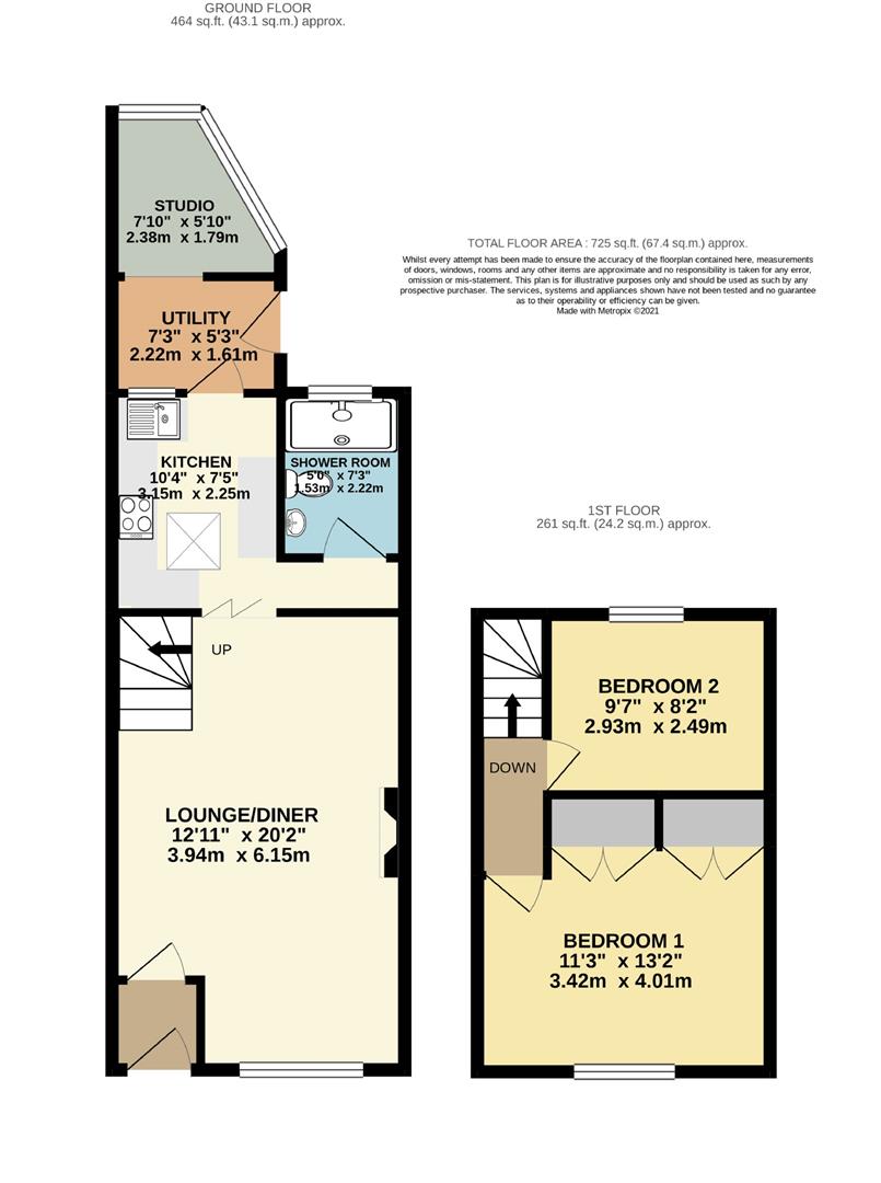The neutral, contemporary shower room-fitted with a white suite-is conveniently located off the kitchen. A hallway between the living and kitchen areas houses a combination boiler and practical shelving. At the rear of the property, you'll find a versatile studio/garden room that includes a utility area with plumbing for both a washing machine and tumble dryer. This additional space can easily serve as a home office, dining room, or playroom.