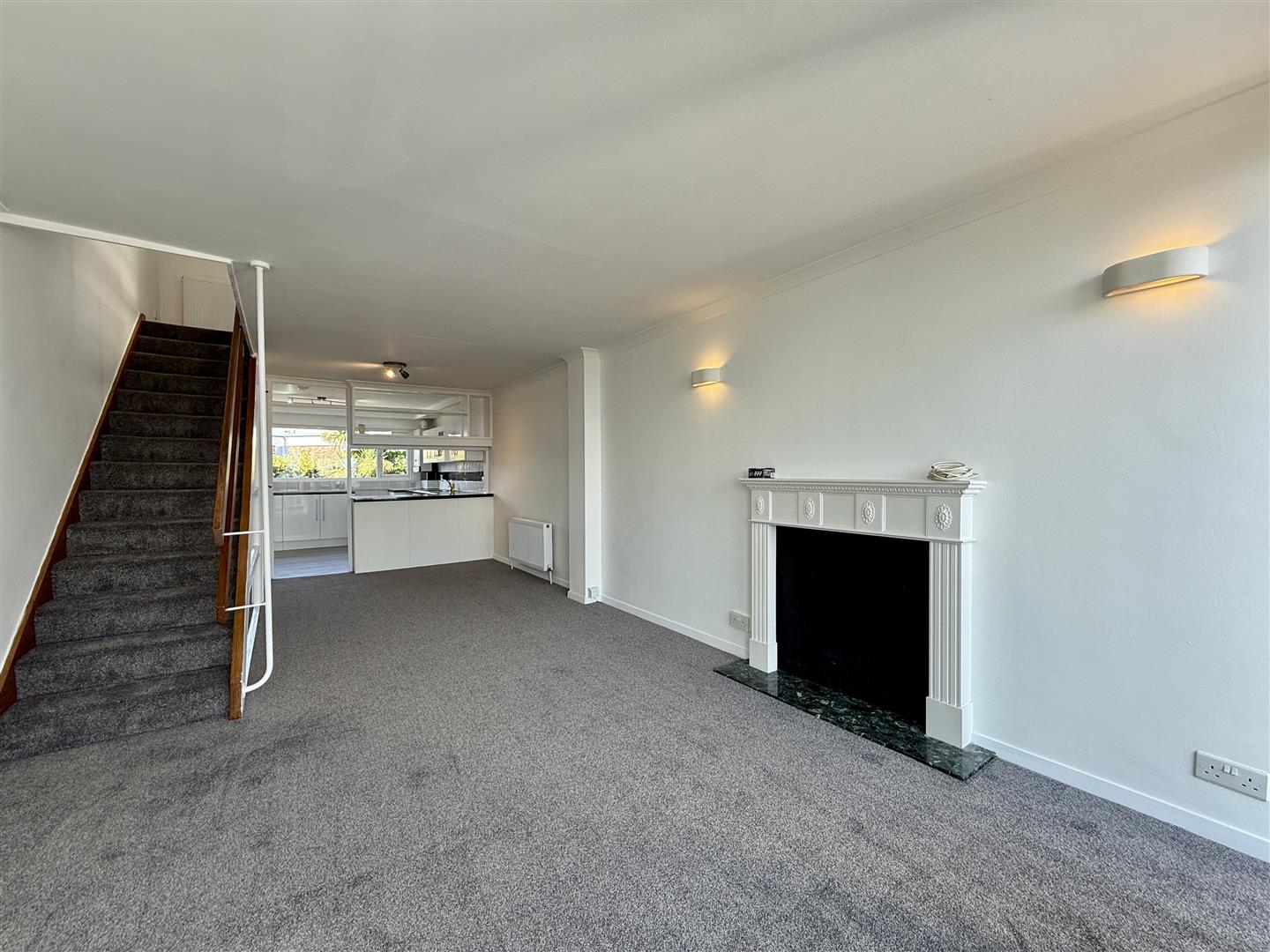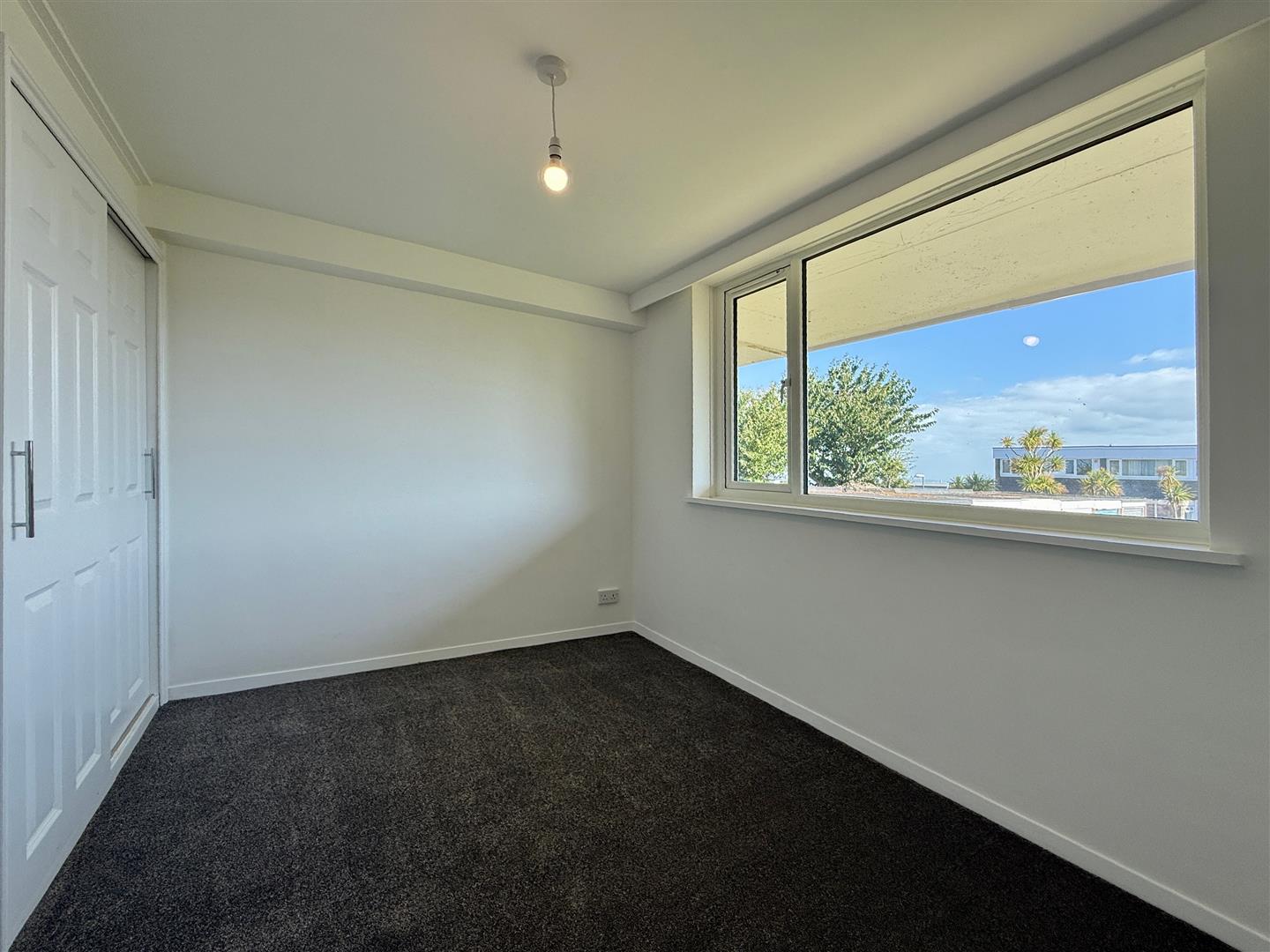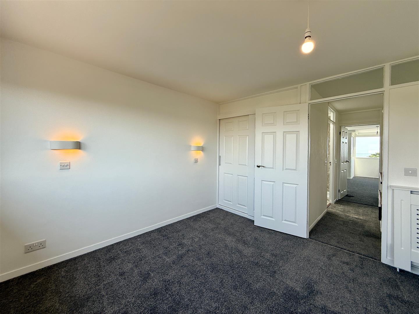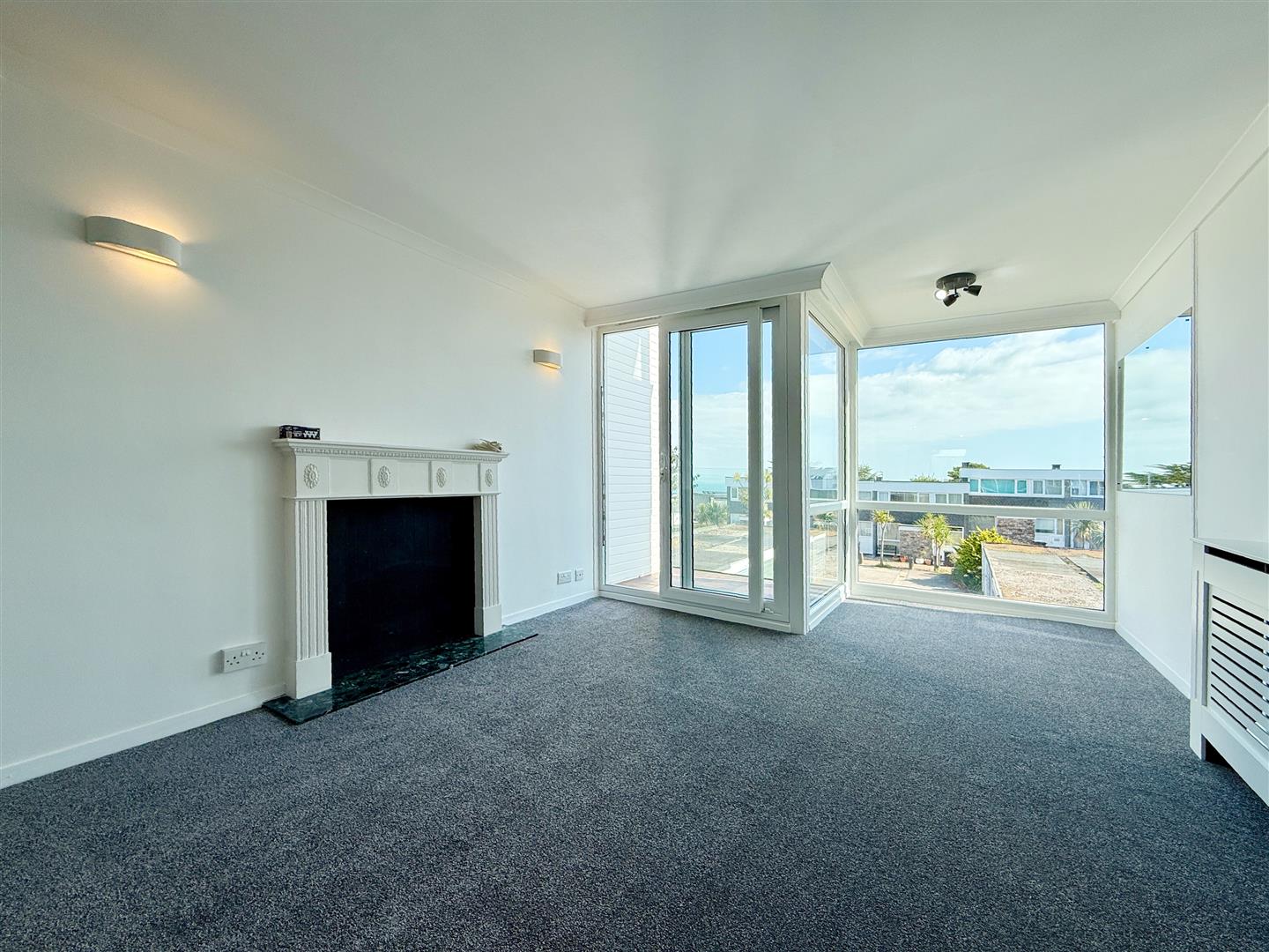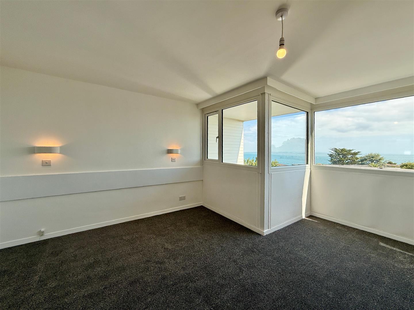 The accommodation is arranged over three levels. The ground floor is accessed via the car port and opens into a spacious entrance hallway with useful storage. This level also includes a generous double bedroom with built-in wardrobe and a modern shower room. On the first floor there is a large living and dining room which enjoys superb coastal views and opens onto a sea view balcony with new glazing, while to the front of the property lies a well-proportioned kitchen. The top floor offers two further double bedrooms, both with built-in storage, and a contemporary family bathroom in between.