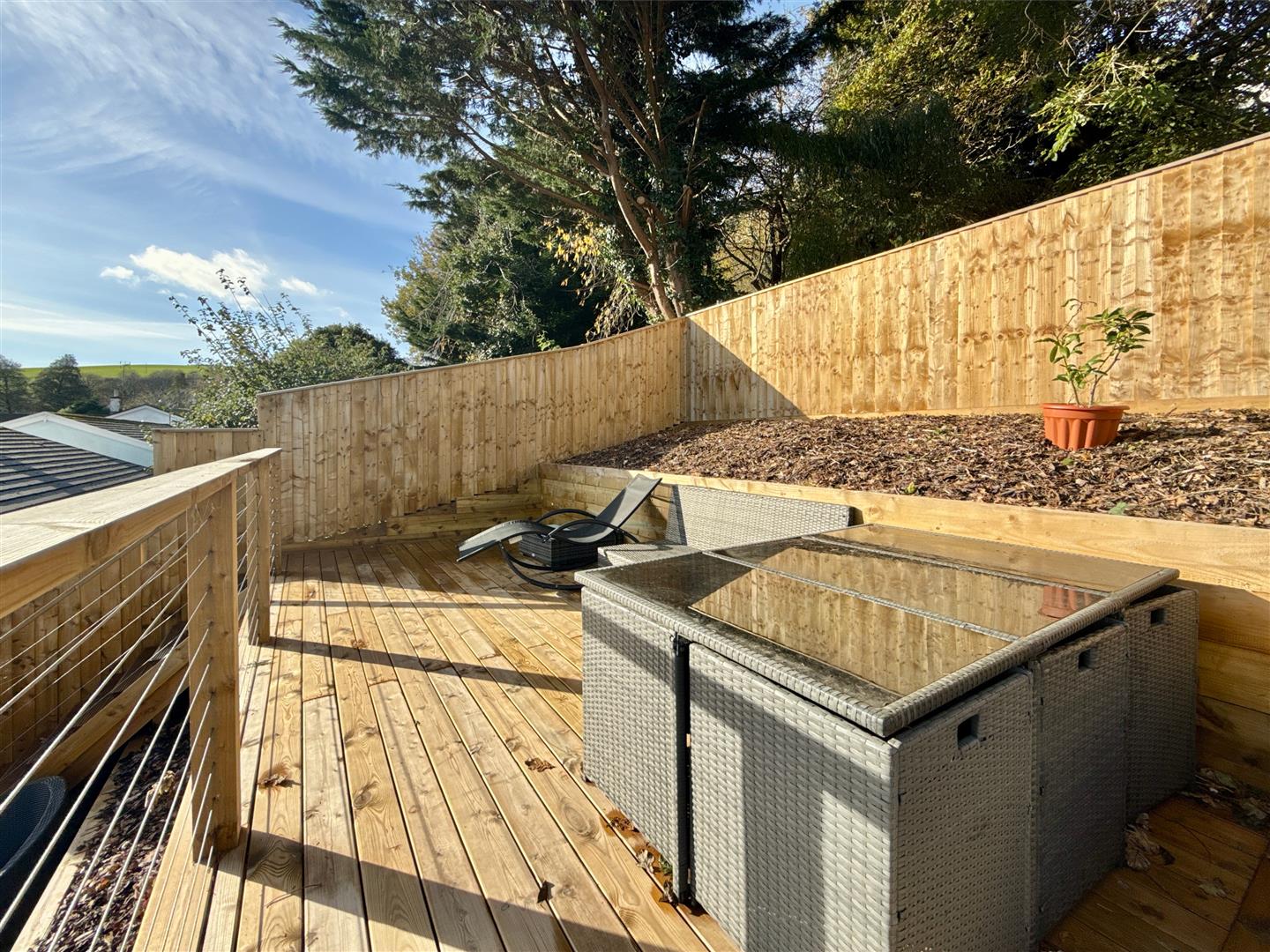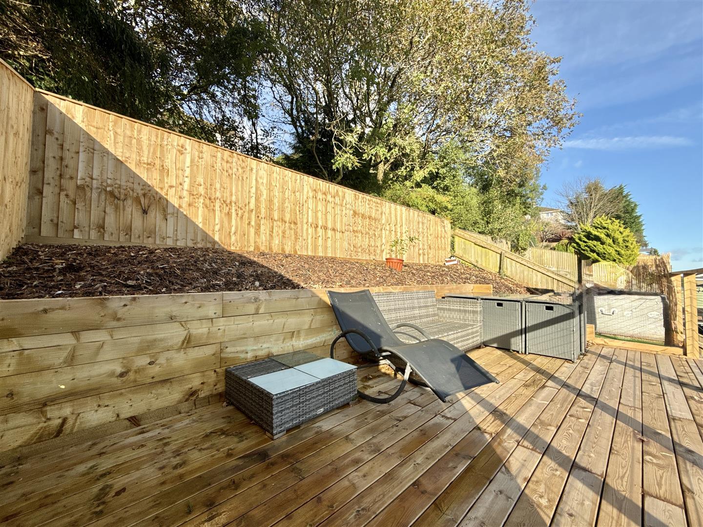 The rear garden is arranged over three levels. The lower level features a low-maintenance area, while the sunny mid-terrace is finished with artificial grass and complemented by natural wood fencing and decking. The top level offers a private retreat with open views and a sunny southerly aspect, making it a true sun trap even in winter.