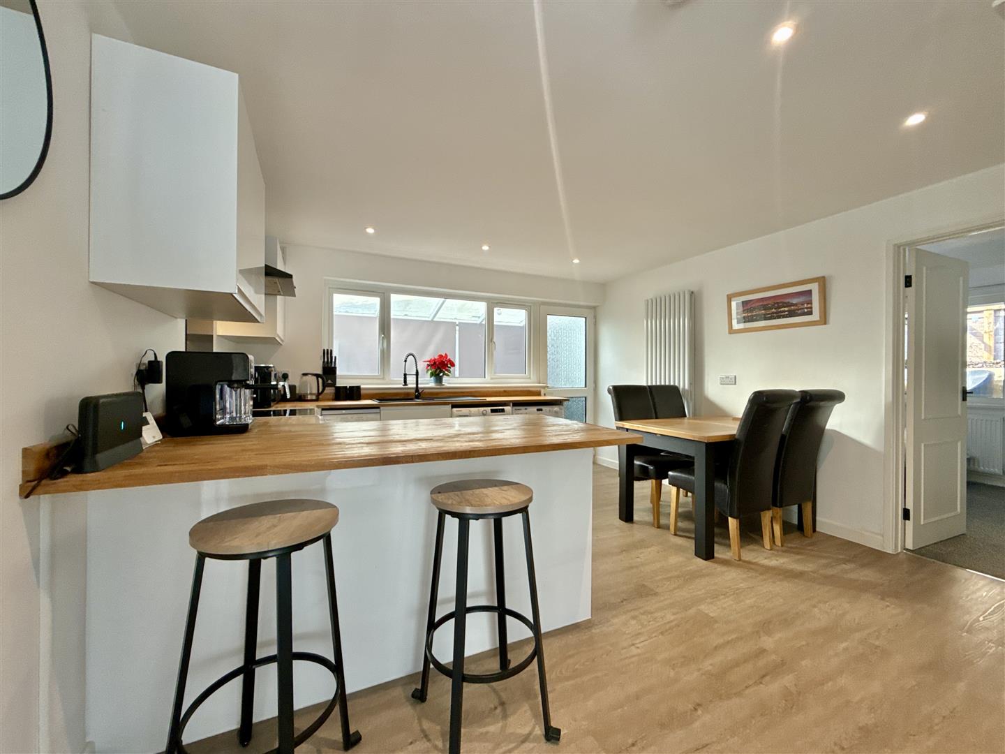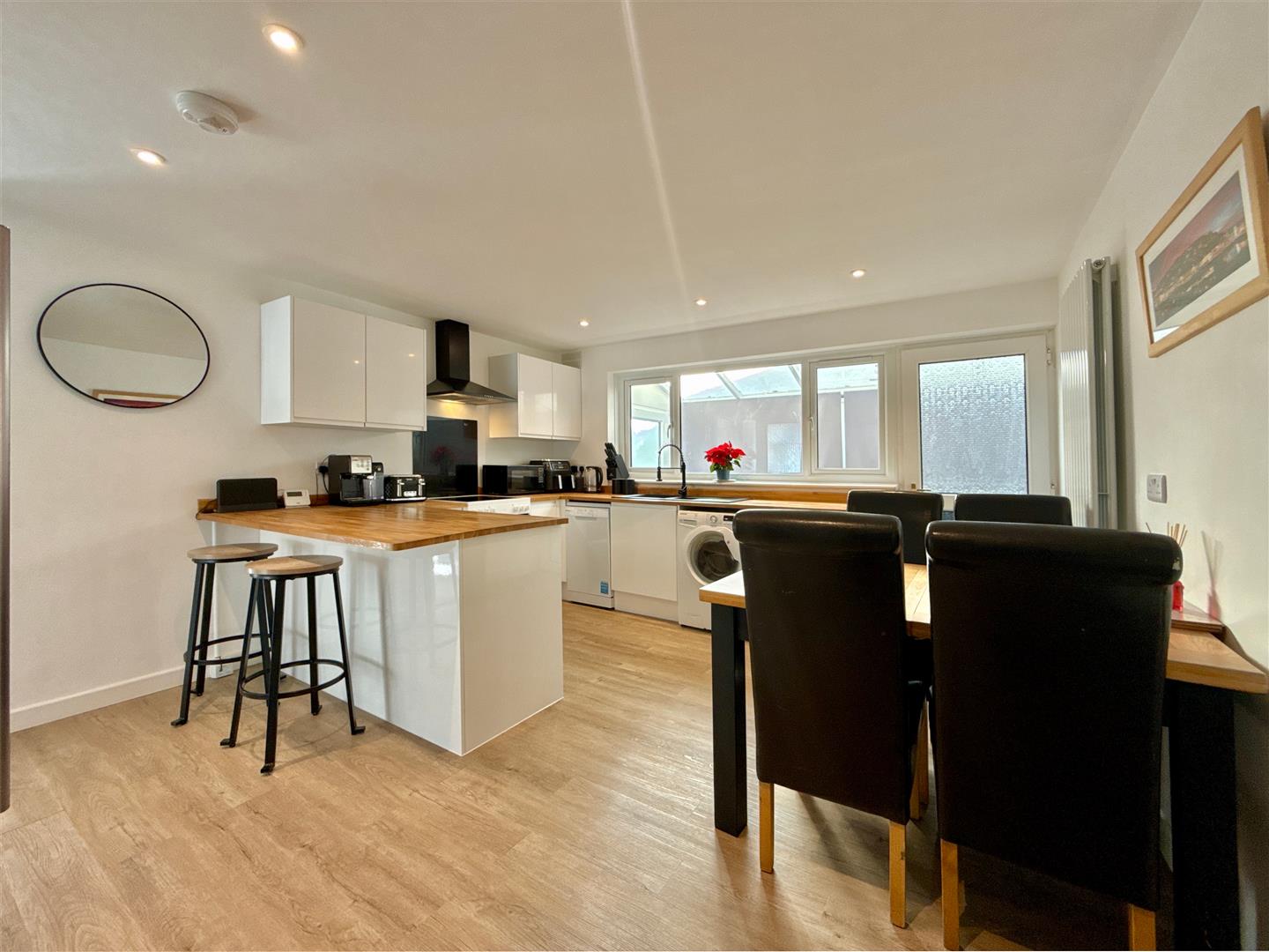 At the heart of the property is a modern kitchen-diner, an impressive space perfect for entertaining. It features a large breakfast bar, room for a dining table, ample worktop space, and plenty of storage, ideal for keen cooks.