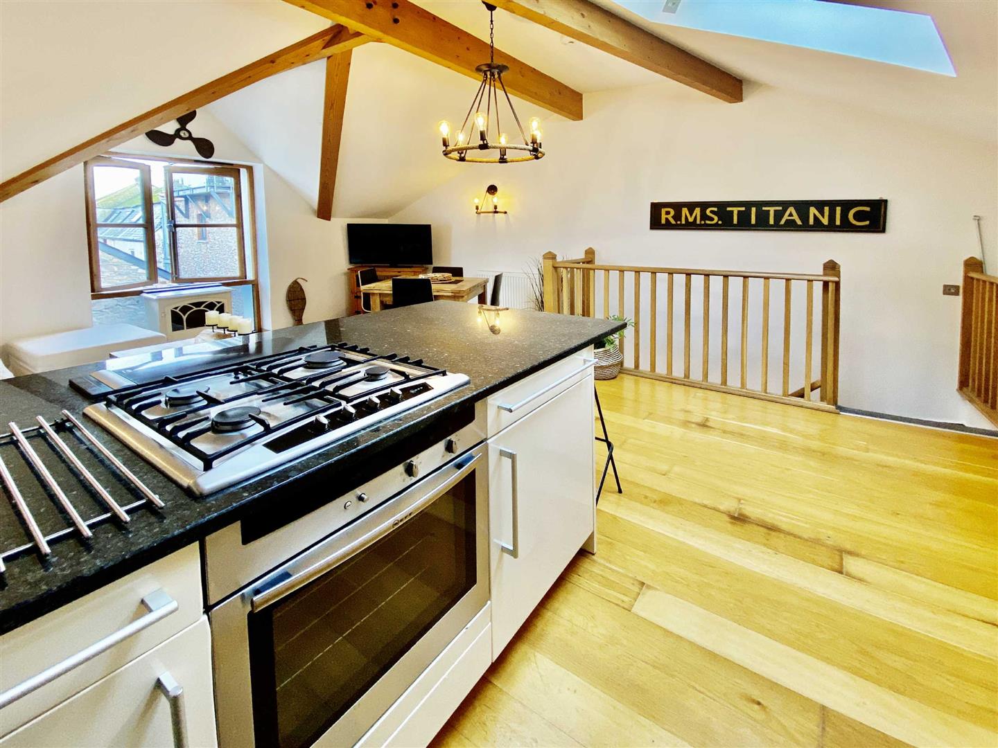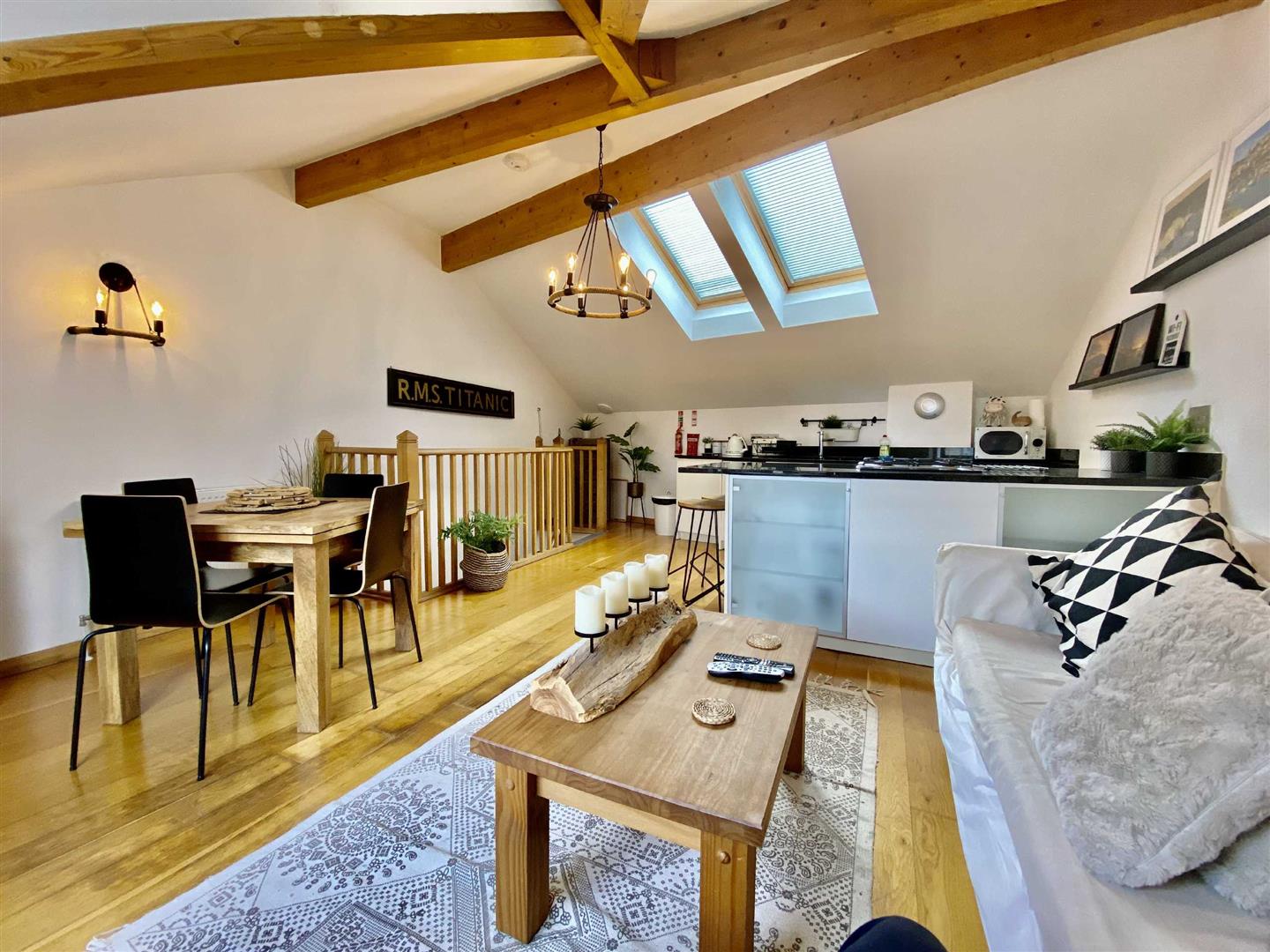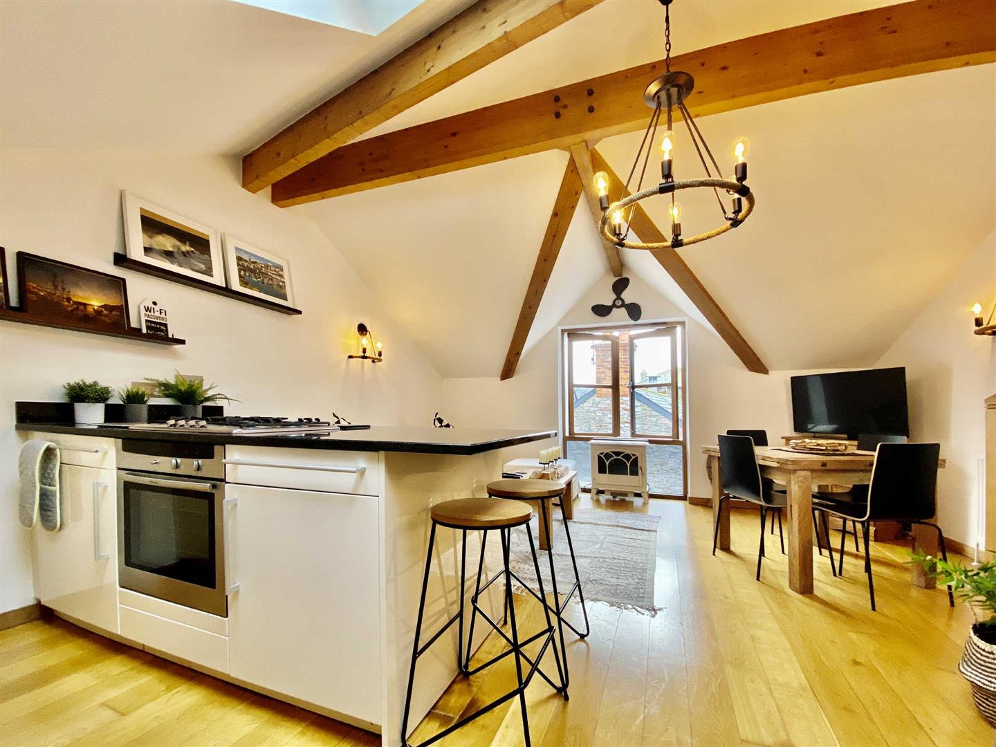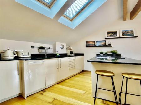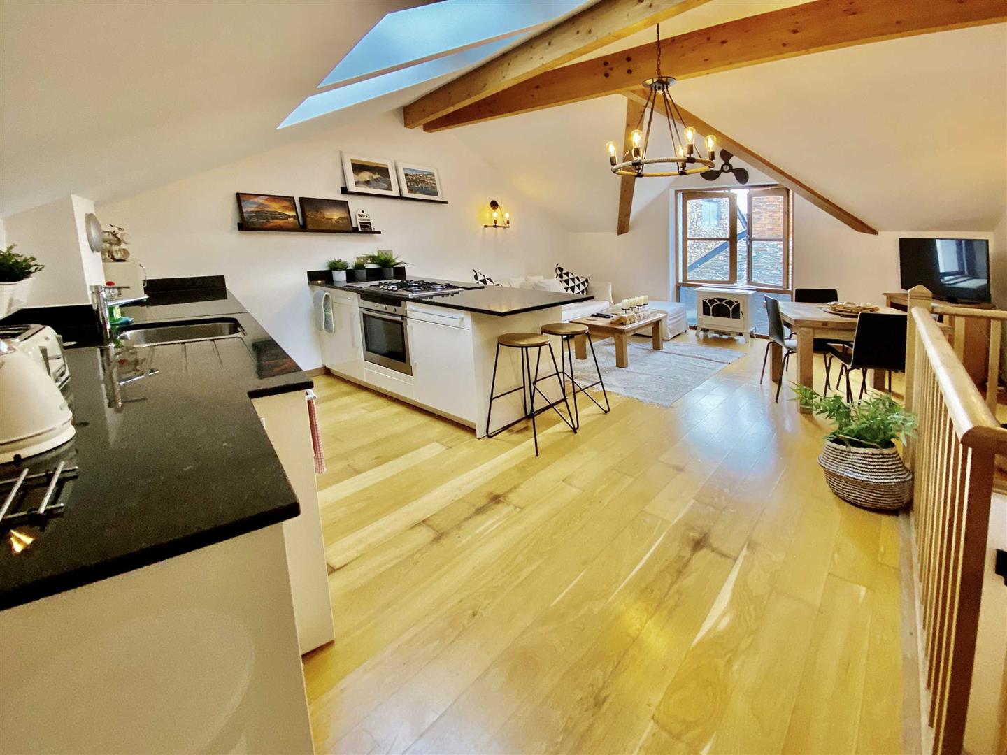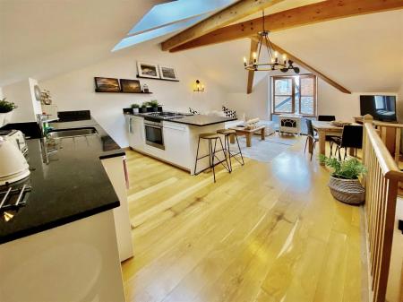 Upstairs, two generous bedrooms and a sleek family bathroom await, with the principal bedroom enjoying its own en-suite. The top floor is the real showstopper: a bright, open-plan living space with vaulted, beamed ceilings, a high-spec kitchen with granite worktops, and plenty of room to entertain or unwind.