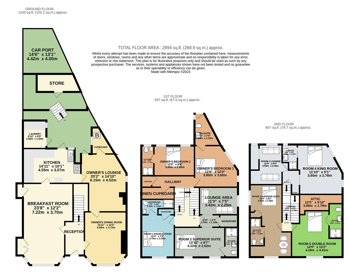 The letting rooms are all very spacious quality double bedrooms, three of which are arranged as suite rooms with lounge areas, and all have en suite facilities. The rooms are all in excellent order with good quality decor and sanitary ware, having been modernised by the current owners. The communal areas include an impressive size lounge/ breakfast room with ample space for all guests at the same time.
