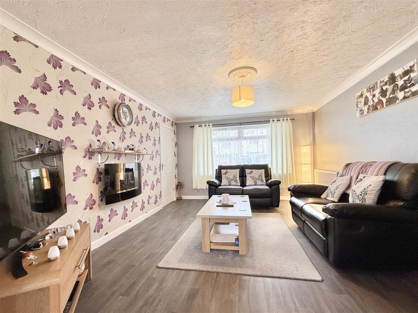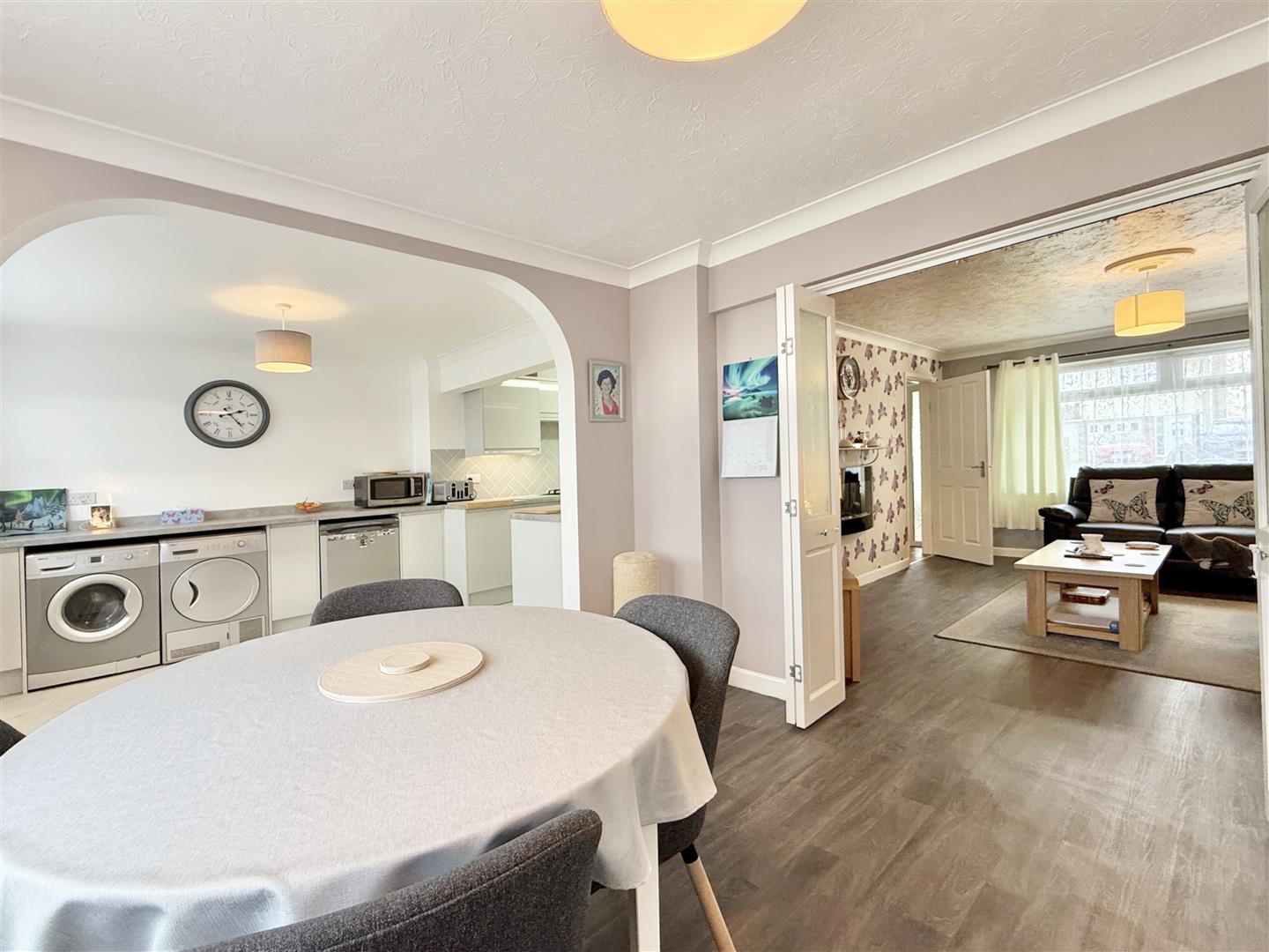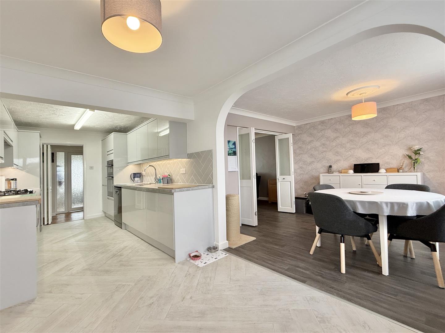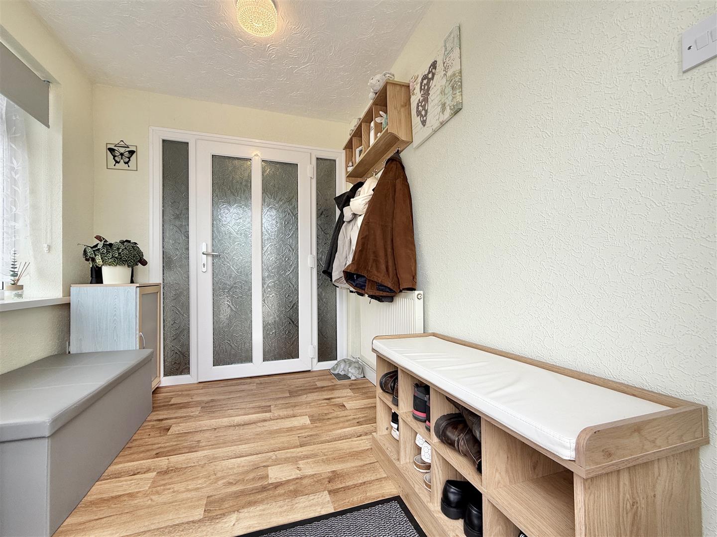 Set behind a neat dwarf wall with decorative planting, the property enjoys extensive driveway parking and a low-maintenance front garden, creating an inviting first impression. A generously sized porch provides a practical and welcoming entrance, offering space for coats, shoes, and seating. Beyond, the hallway is light and spacious, featuring wood-effect flooring and a neutral colour palette that flows seamlessly throughout the home.