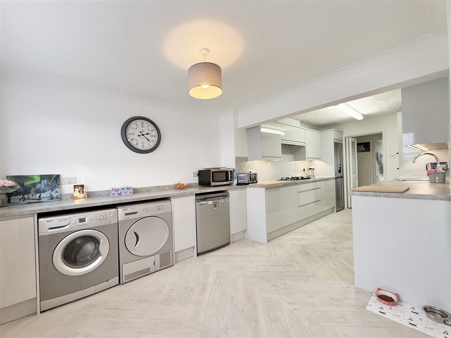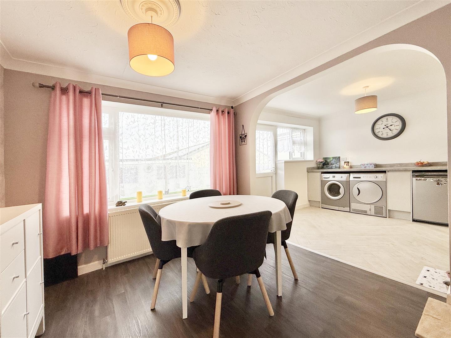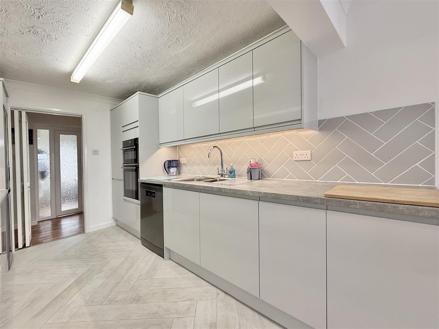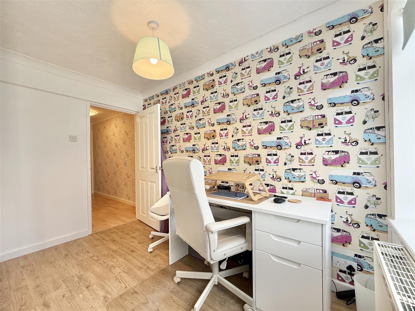 Set behind a neat dwarf wall with decorative planting, the property enjoys extensive driveway parking and a low-maintenance front garden, creating an inviting first impression. A generously sized porch provides a practical and welcoming entrance, offering space for coats, shoes, and seating. Beyond, the hallway is light and spacious, featuring wood-effect flooring and a neutral colour palette that flows seamlessly throughout the home.