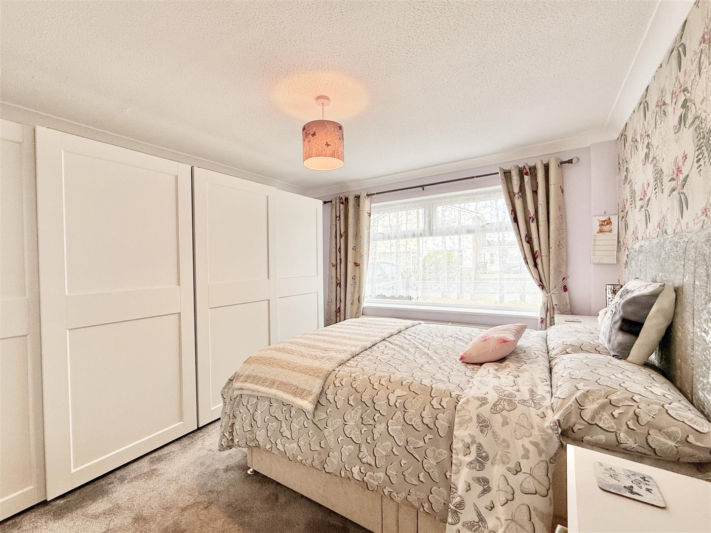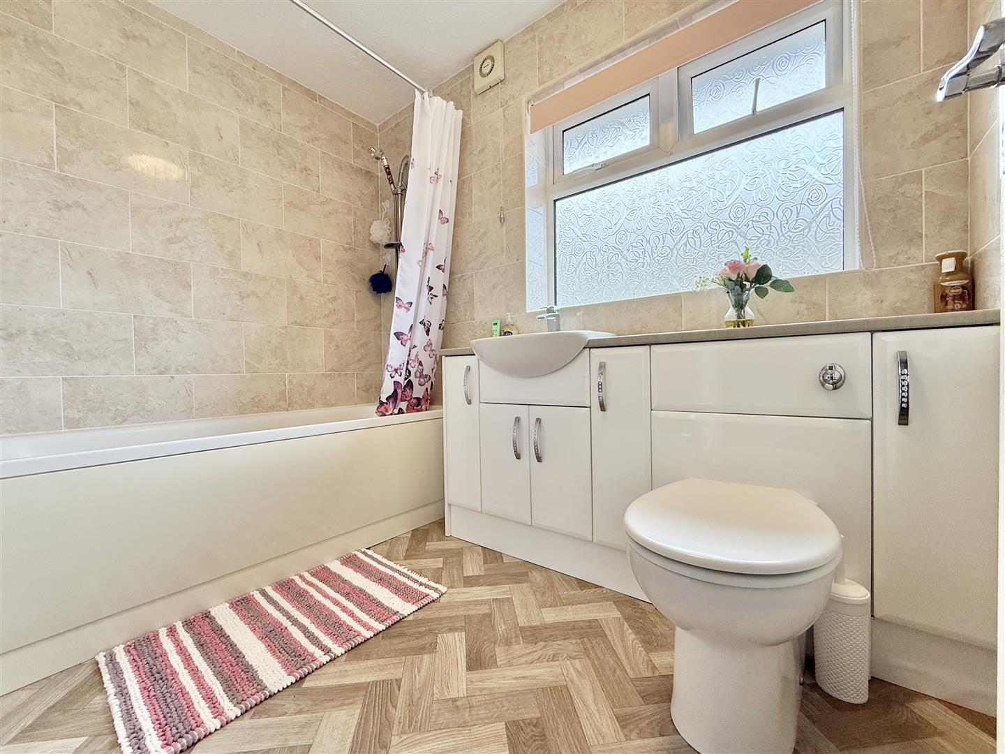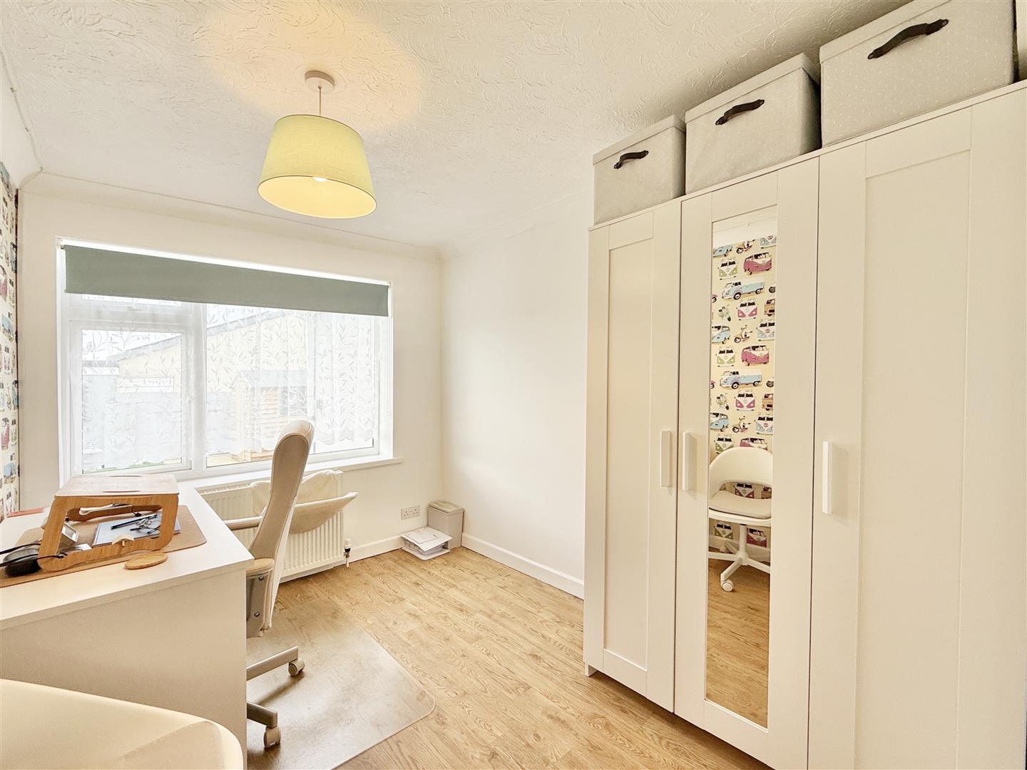 All three bedrooms are well proportioned, with the principal bedroom benefiting from built-in storage and a bright front-aspect window. The remaining bedrooms offer flexibility for guests, hobbies, or home working. The property also features two spacious and well-appointed bathrooms: a full family bathroom with bath, WC, and storage, and a separate shower room with a modern enclosed shower and fitted basin unit.