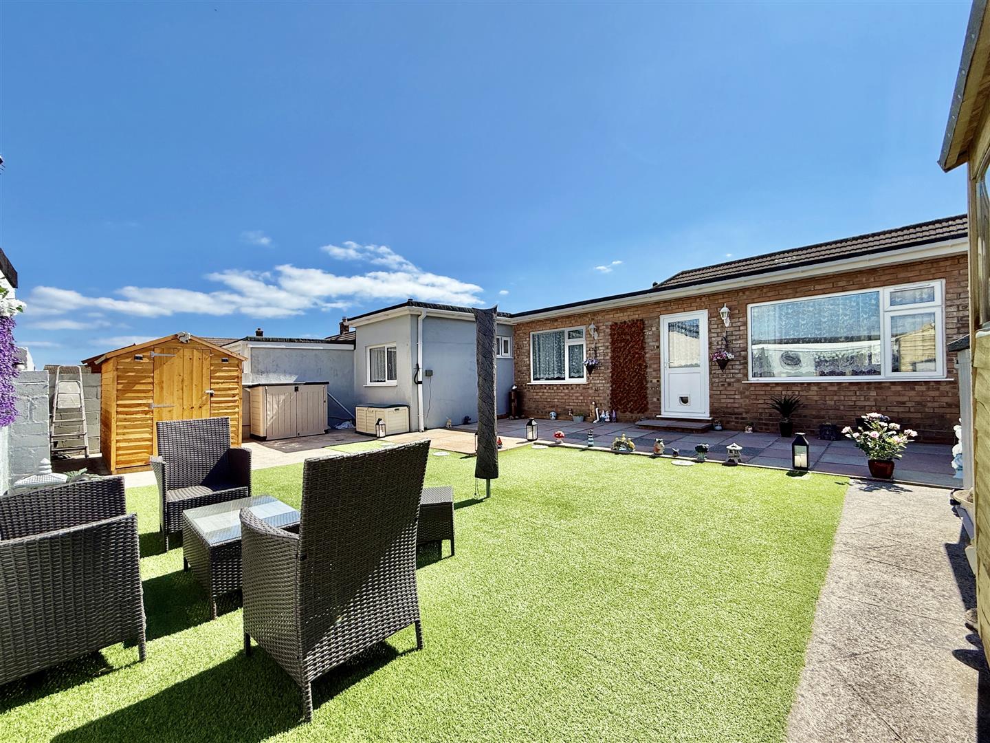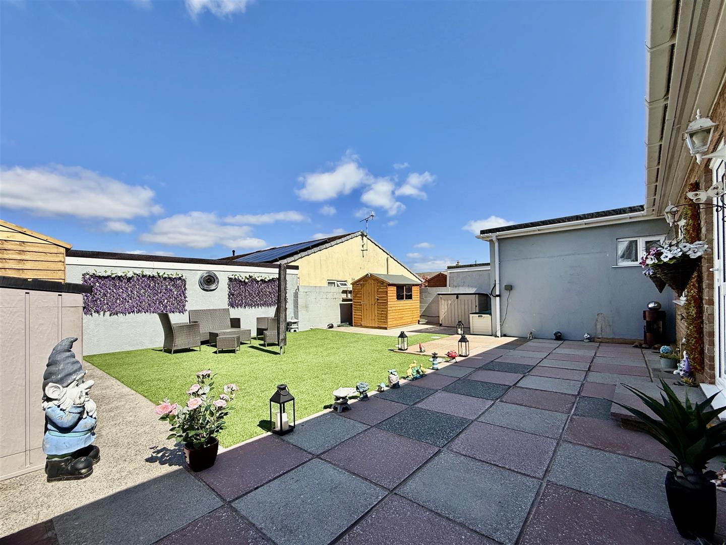 The rear garden has been carefully designed for ease of maintenance, with a wide patio ideal for entertaining, perimeter pathways, and a central area of artificial lawn. Two garden sheds-one with light and power-offer excellent storage, while the sunny orientation makes this a fantastic space to relax and enjoy outdoor living.
