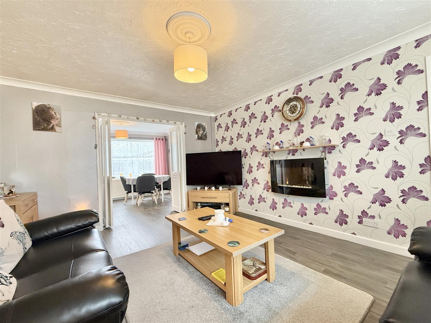 The living accommodation is bright, versatile, and thoughtfully arranged. The main sitting room is a generous space, complete with grey wood-effect flooring, a contemporary feature wall, and a striking black gloss fireplace as a central focal point. Folding doors open into the dining space and recently upgraded kitchen, creating a true hub of the home.