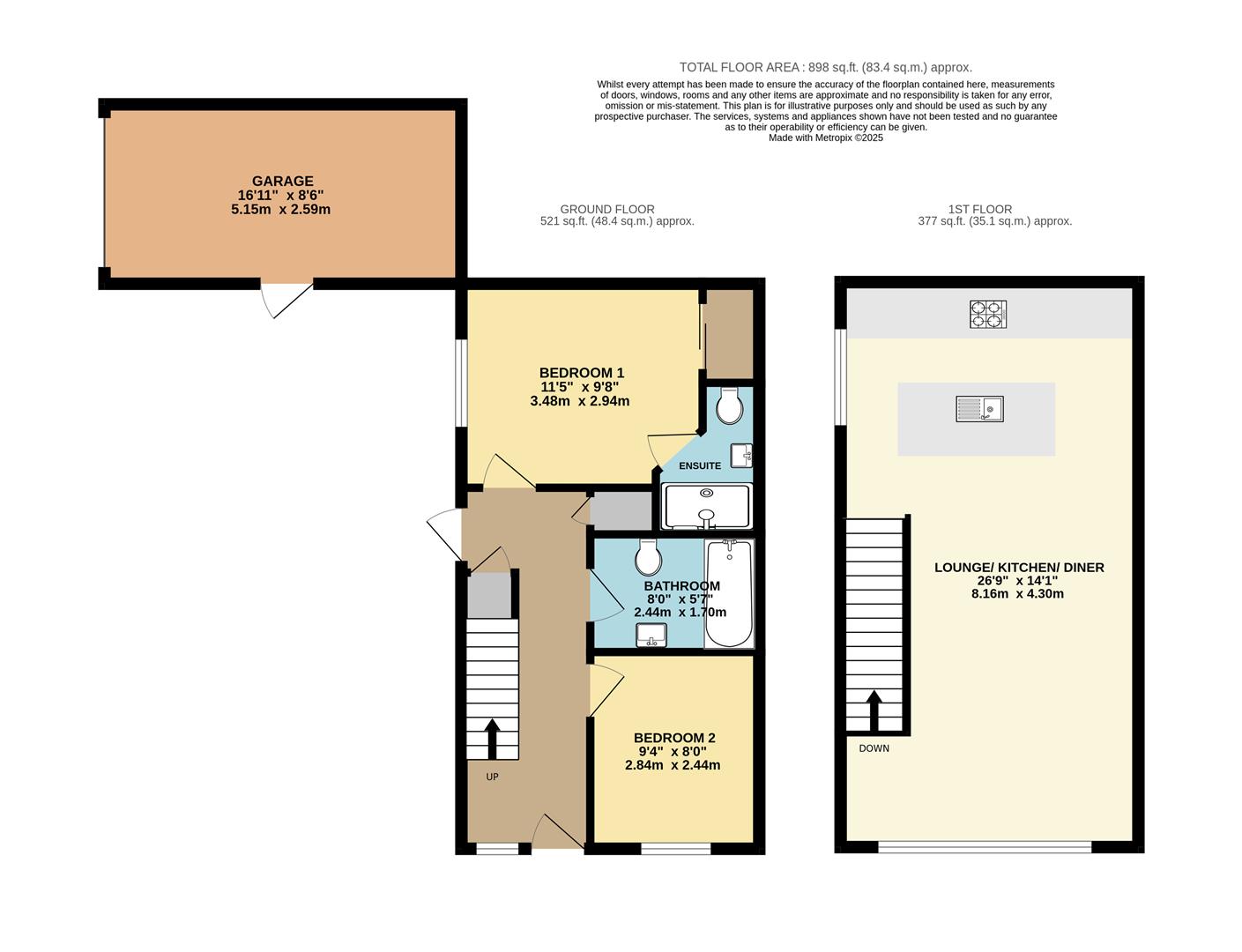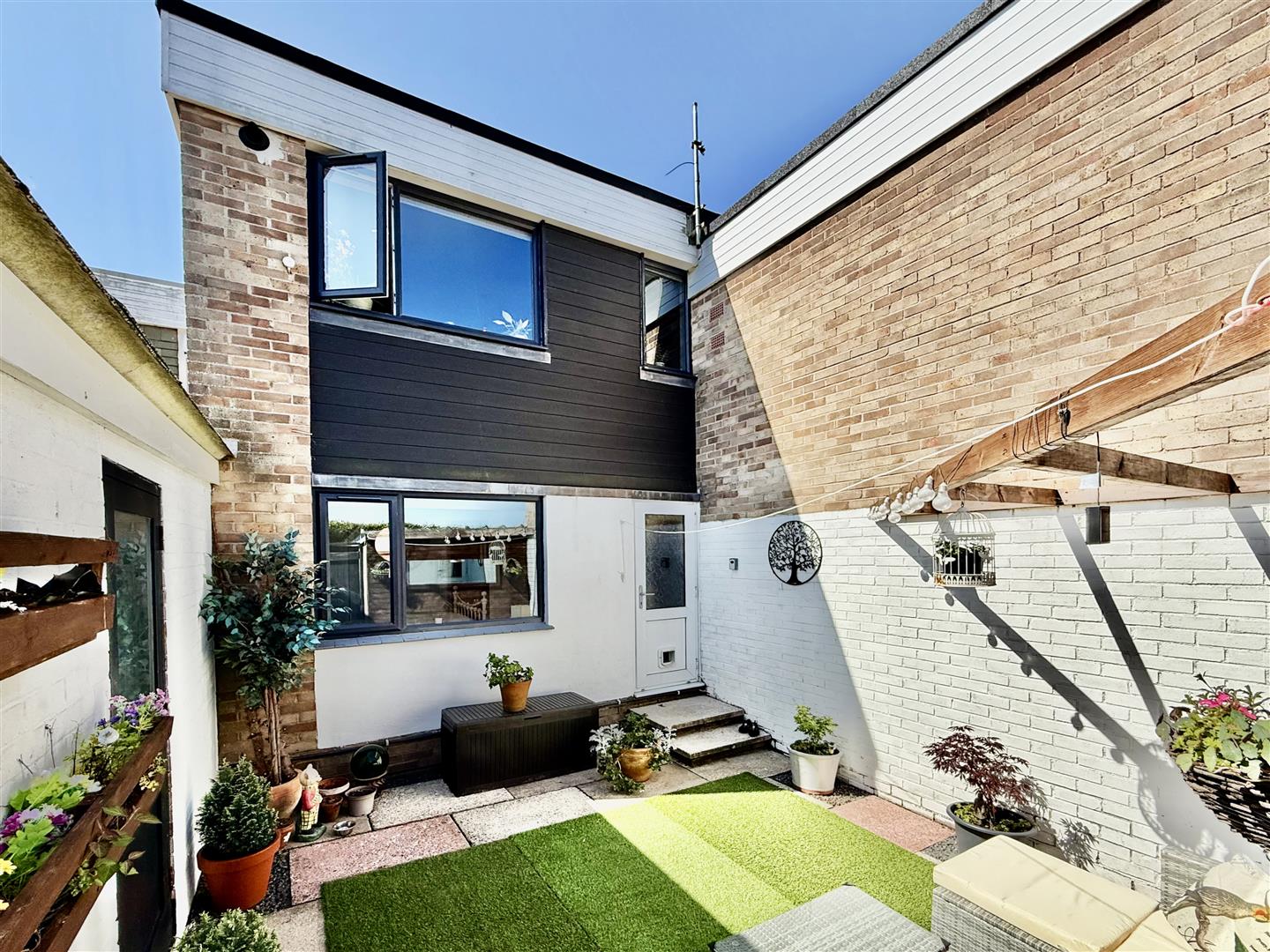 Outside, the front garden is neat and low-maintenance, with artificial grass and raised sleeper beds creating a tidy first impression. To the rear, a stylish private courtyard provides a quiet spot to enjoy a drink, dine alfresco, or simply unwind at the weekends. There's also direct access to the attached garage, which comes with power, lighting, and an up-and-over door - great for storage, parking, or even a workshop space.