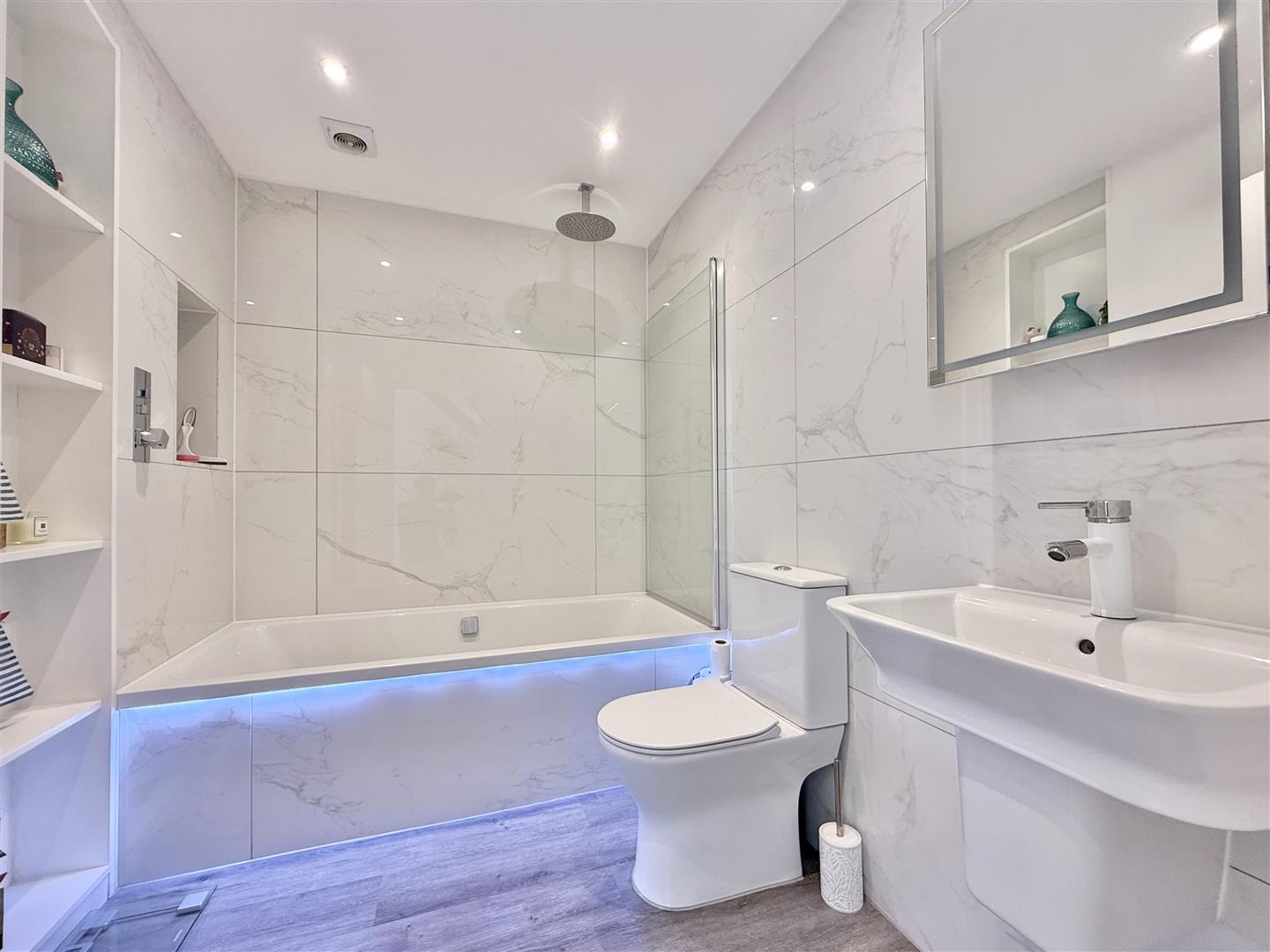 Both bedrooms are located on the ground floor, offering peaceful, well-proportioned spaces for rest and relaxation. The principal bedroom includes a generous walk-in wardrobe and a sleek en-suite wet room, finished with quality tiling and modern fittings. The second bedroom is ideal for guests, children, or as a home office, while the main bathroom feels more like a boutique hotel - with a double-ended bath, rainfall shower, inset shelves, and a smart back-lit vanity mirror.