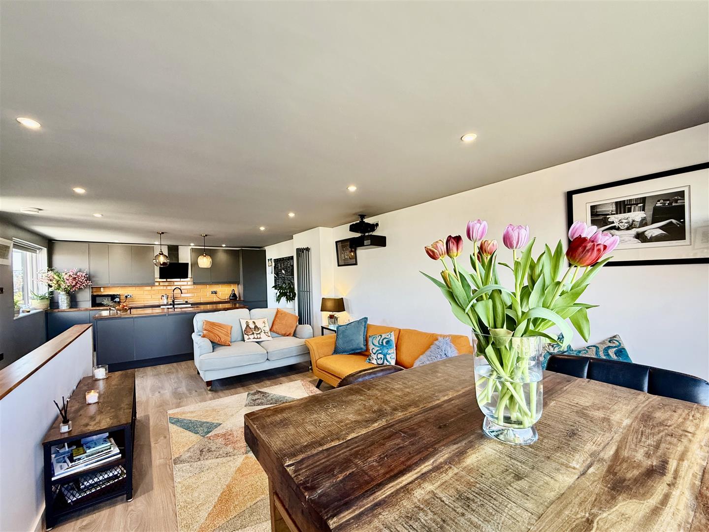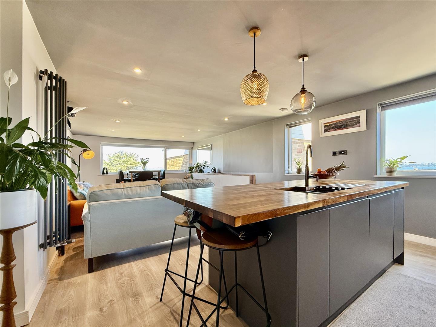 Upstairs, you're greeted by a truly impressive open-plan living, dining, and kitchen space. With large picture and side windows offering beautiful sea and coastal views across Brixham, Paignton and even out toward Torquay, this space is flooded with natural light and offers a real sense of calm. The kitchen itself features elegant matt grey units, striking black American walnut worktops, and a central island with breakfast bar - ideal for casual dining or hosting friends. Integrated appliances and thoughtful design touches complete the look.