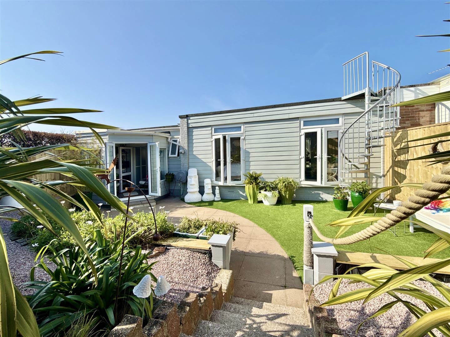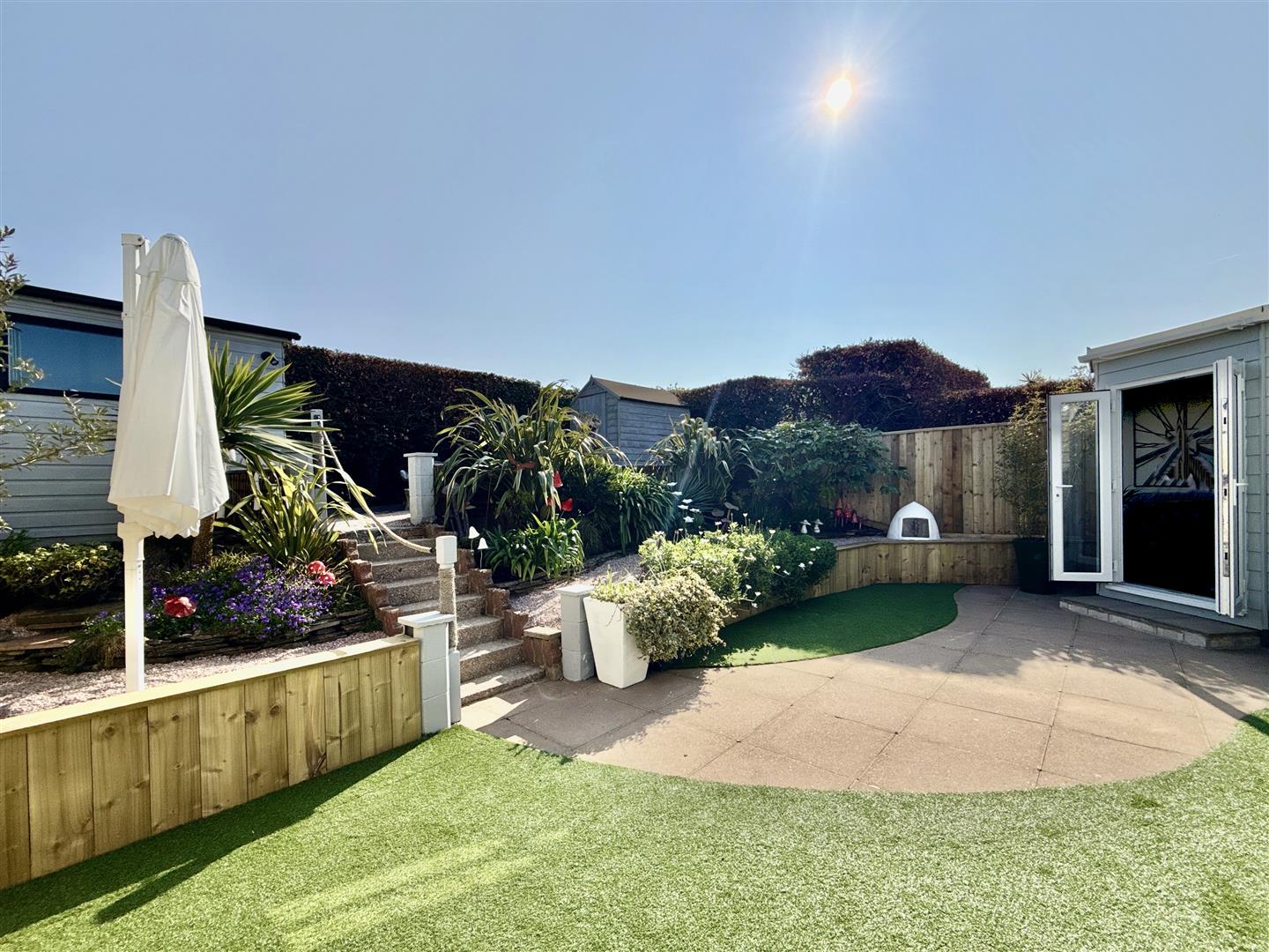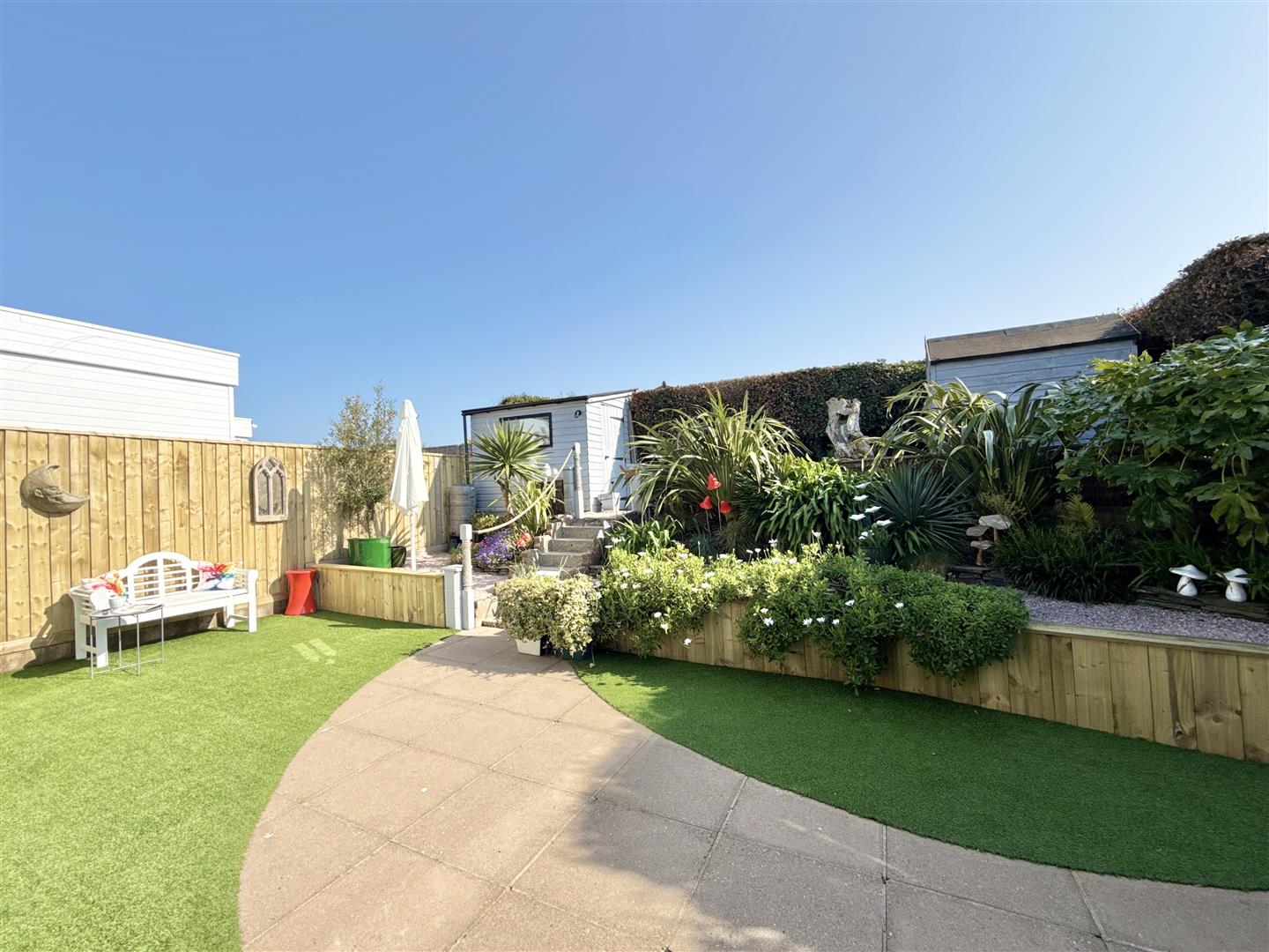 The rear of the property is another recent improvement by our vendor, who has cleverly added a useful hallway providing plenty of storage options, leading through to a wonderful garden room, opening out through French doors to the rear garden. South-facing (so enjoying plenty of sunshine) and very private, the garden here is of particular note. Beautifully landscaped over two levels and broken with a colourful display of greenery, the lower patio area is perfect for quiet afternoons in the sunshine or hosting BBQ's. The higher level is a shaded area laid to gravel and occupying two useful garden sheds. The property enjoys the unusual benefit of a galvanised steel spiral staircase, elevating you to a large roof terrace which takes in improved views over Torbay. The roof terrace currently offers a 'blank canvass' ready for a new buyer to adopt as they wish.