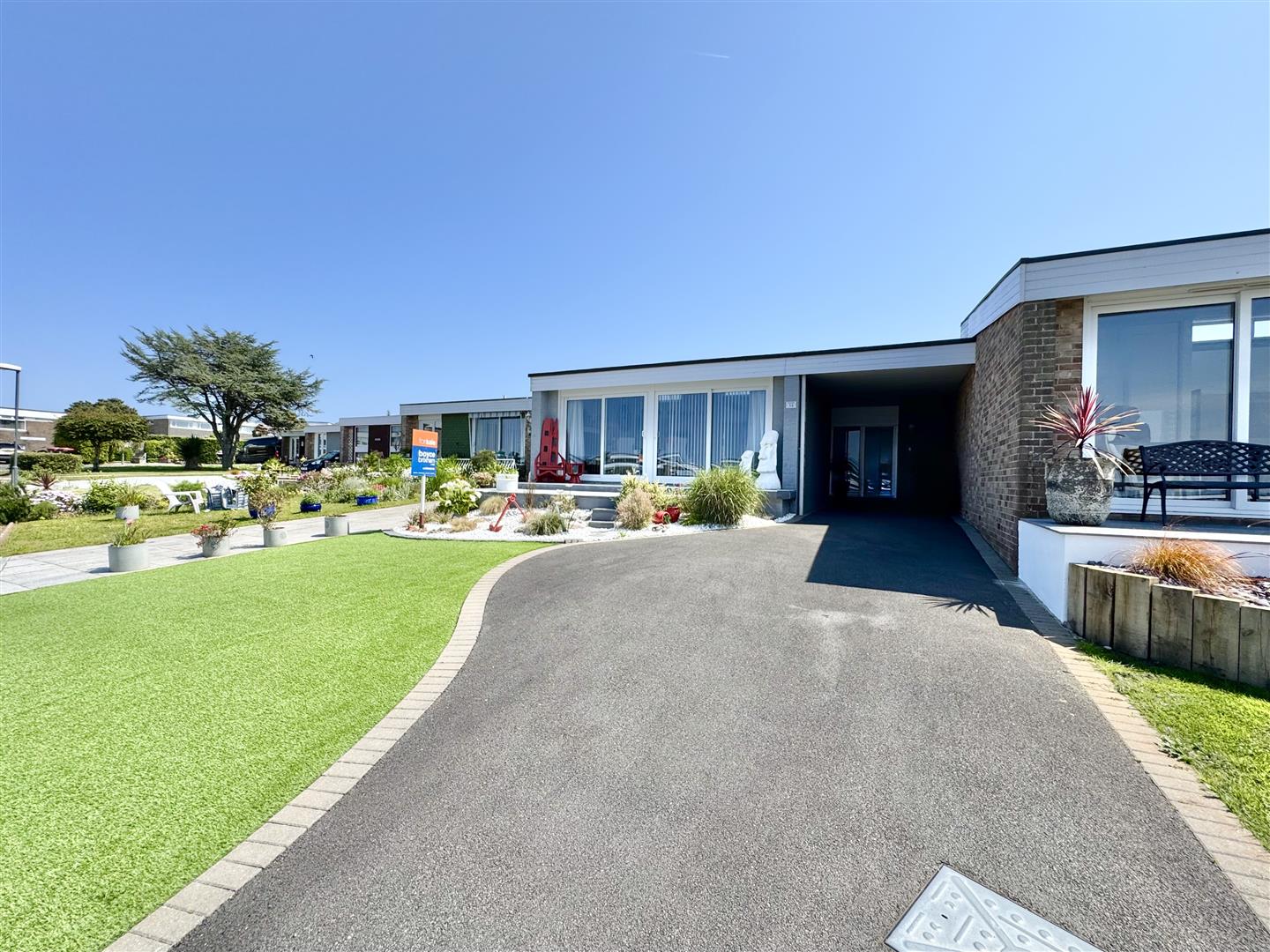 The appealing frontage boasts a low-maintenance artificial grass lawn in front of an eye-catching feature garden, flanked by ample driveway parking for 2-3 cars with the car-port also providing dry shelter.