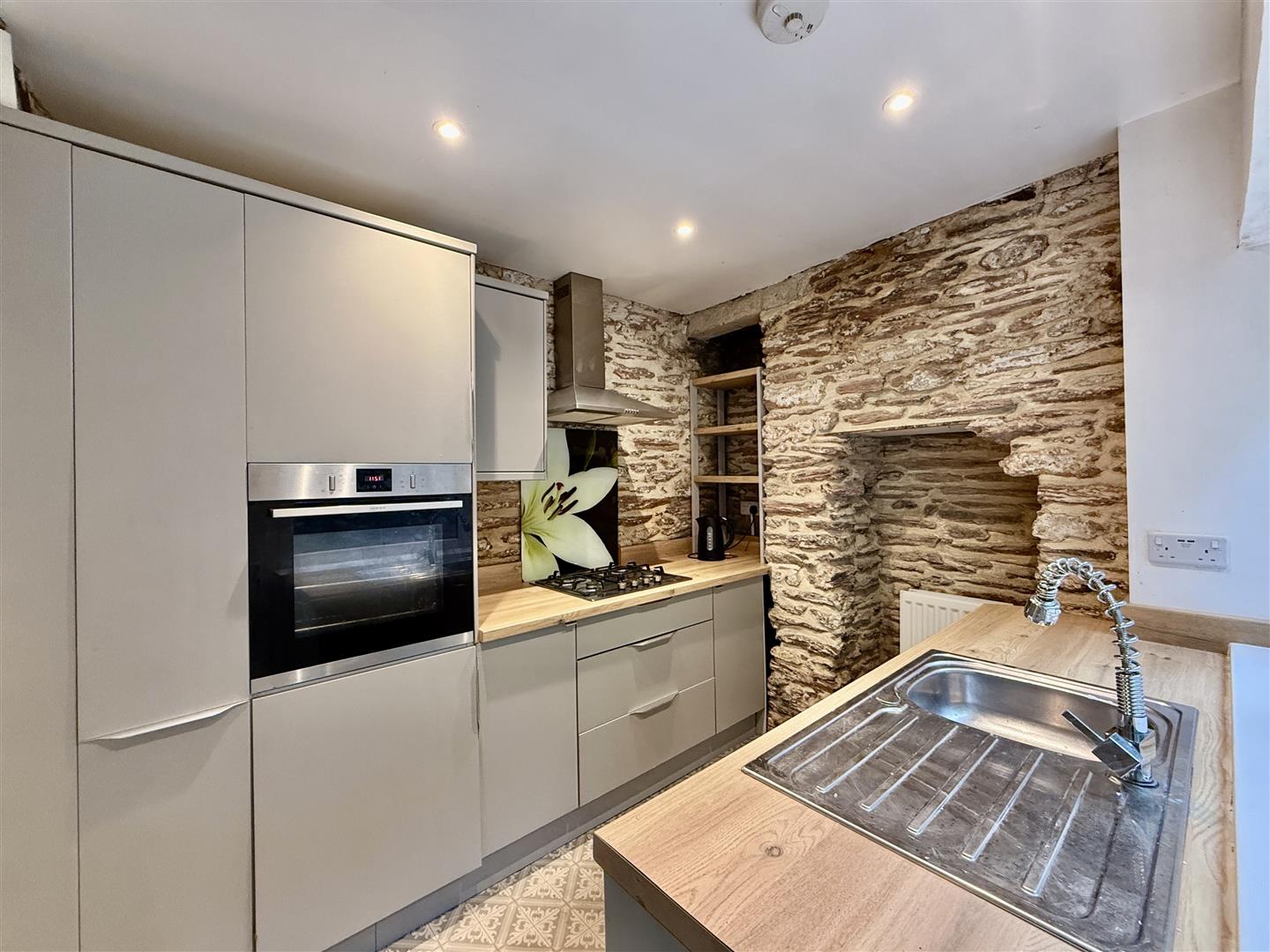 To the rear is a very stylish fitted kitchen, thoughtfully designed to blend modern living with the character of the cottage. It is equipped with an inset gas hob, premium 'Neff' oven, and ample cupboard and worktop space (with space for washing machine and fridge/freezer..