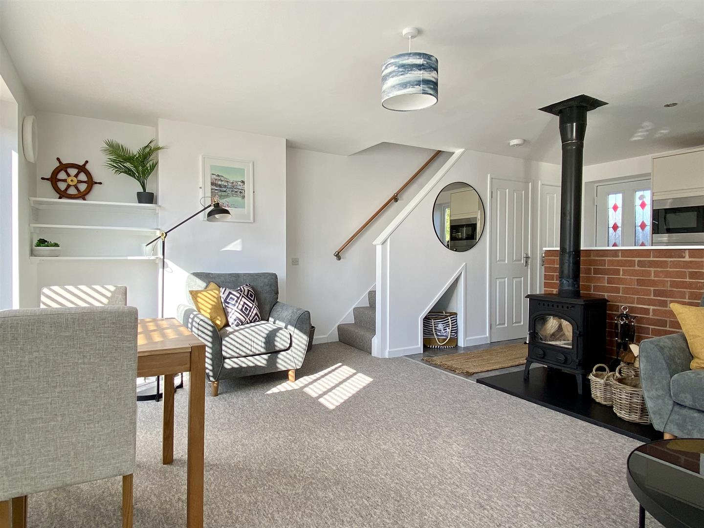 The property itself is set back from the roadside, and down - giving the plot a particular feeling of privacy. You enter via a courtyard entrance into a large, very light and-bright open plan living space. To your left is an modern and well-arranged kitchen. Neatly separated from the rest of the living space by a low wall and equipped with quality appliances. The main living space is versatile in it's arrangement, with plenty of space for separate lounge and dining set-ups. A premium wood burner makes for a real feature and creates plenty of warmth in colder months. There is also a large utility cupboard under the stairs offering plenty of storage.