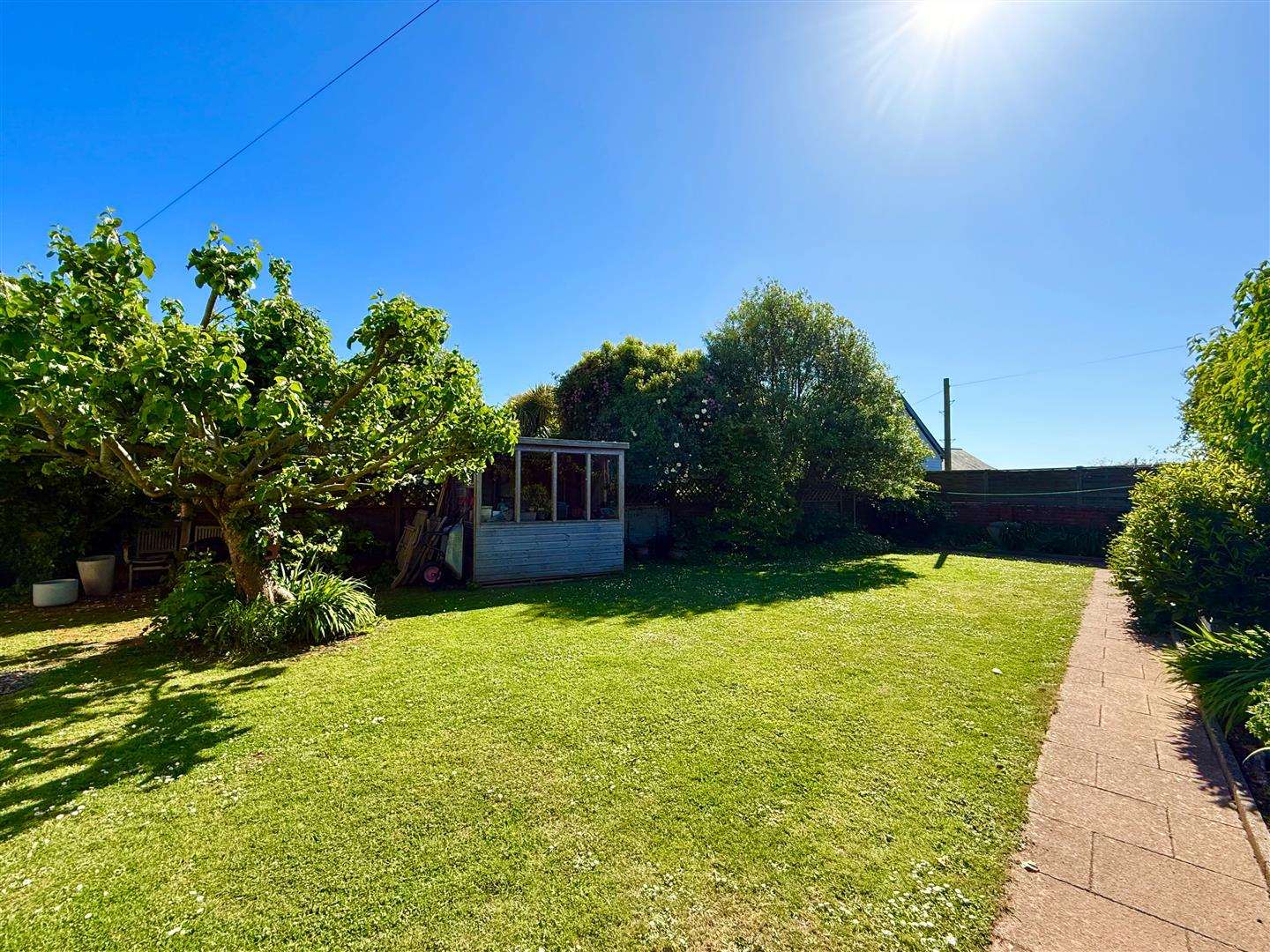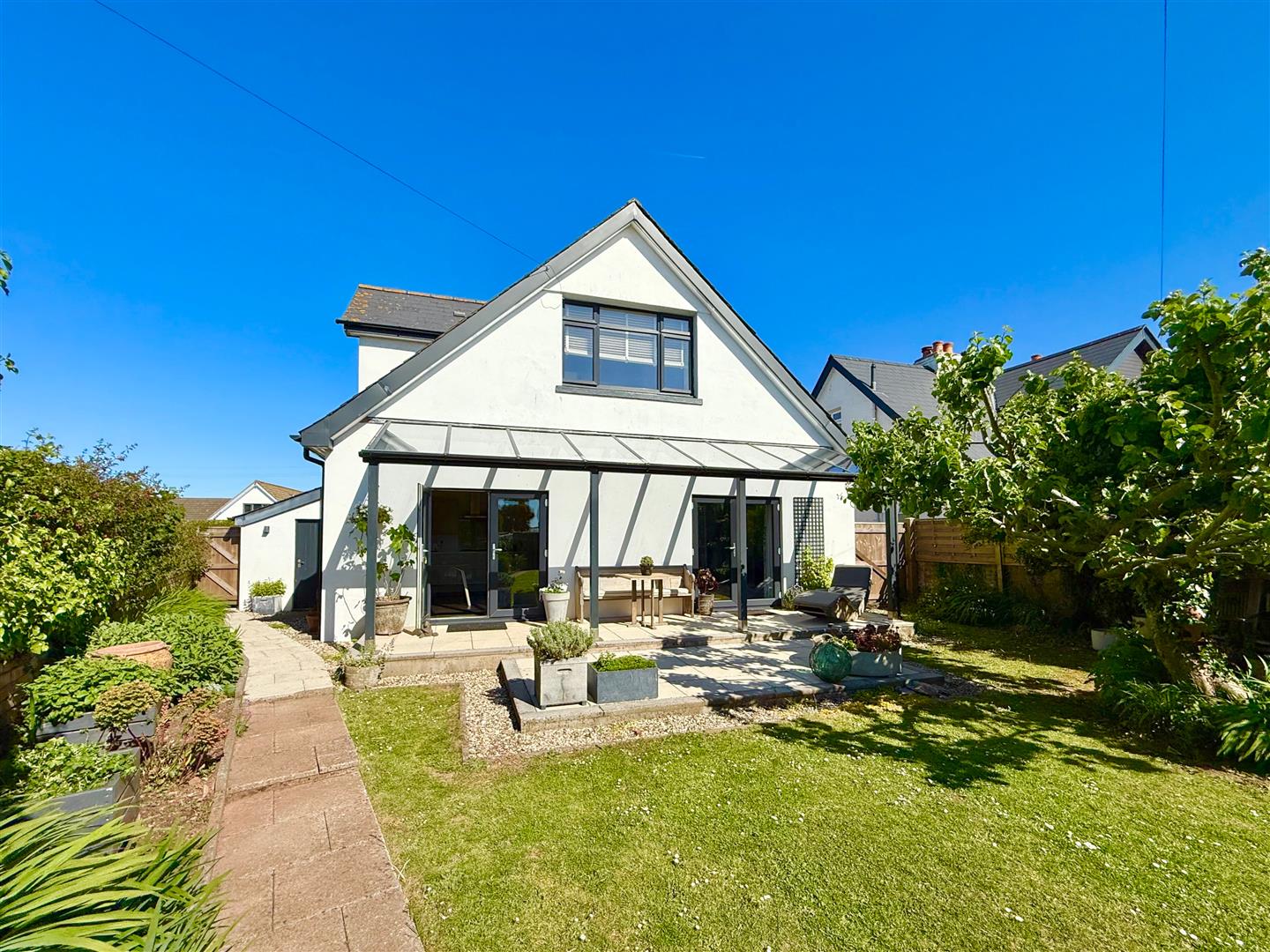 From the garden, you can enjoy a lovely view back towards the property, showcasing its attractive rear elevation and the thoughtful landscaping that enhances the overall setting. It's a peaceful, private haven just minutes from the coastline.