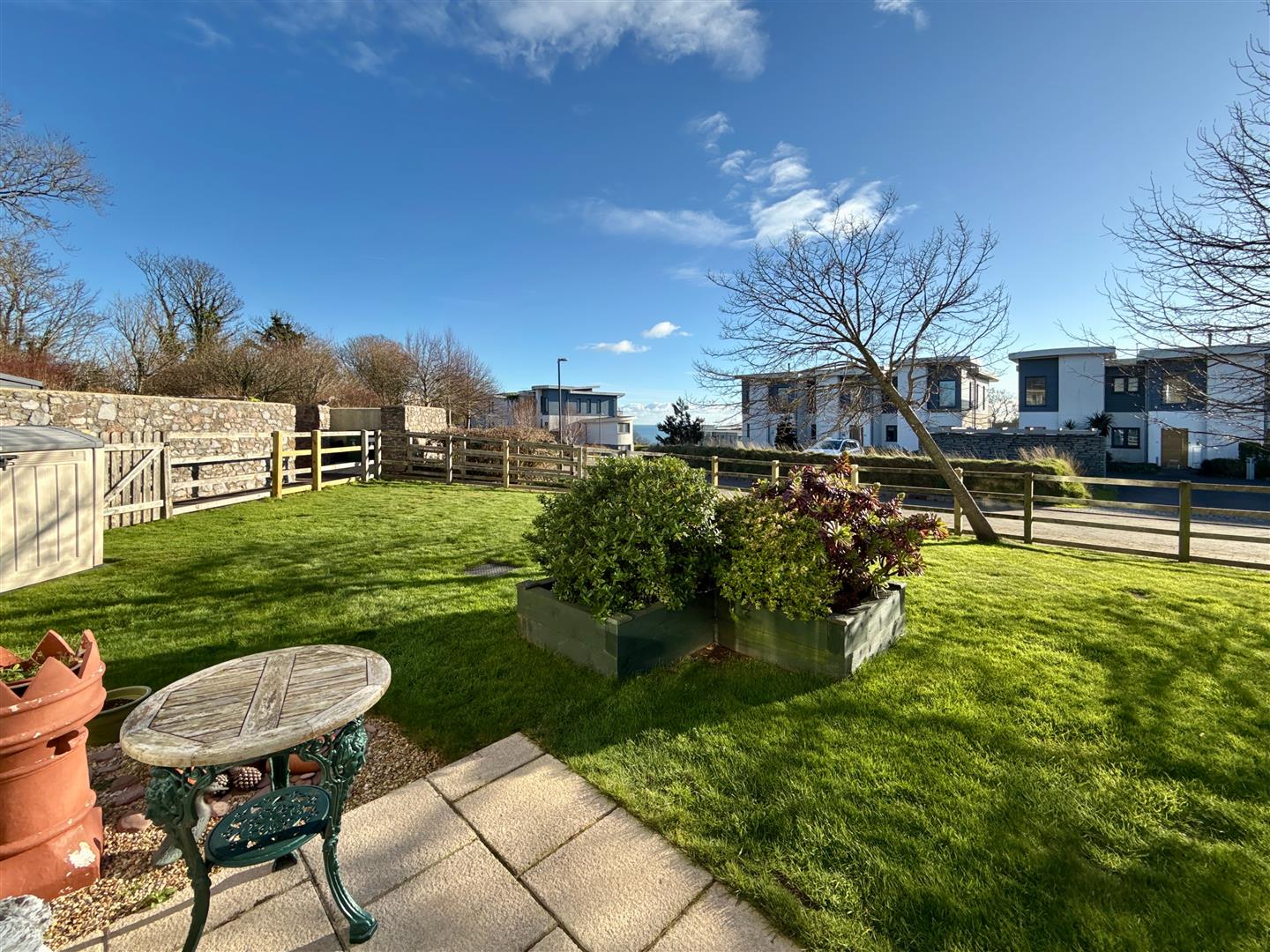 Outside, the private garden is a real highlight: level, sunny and perfectly positioned to enjoy its southerly aspect. With open views across the development and out to sea, it provides a peaceful and sheltered space to relax, dine or simply take in the surrounding scenery.