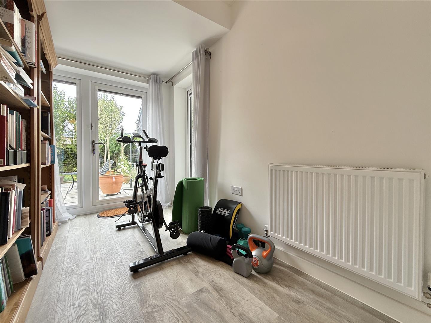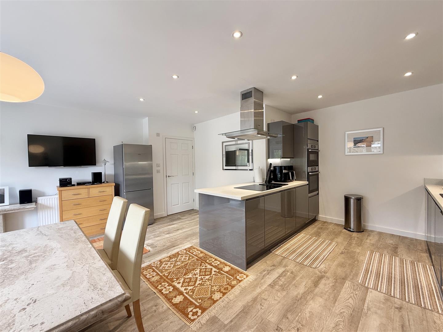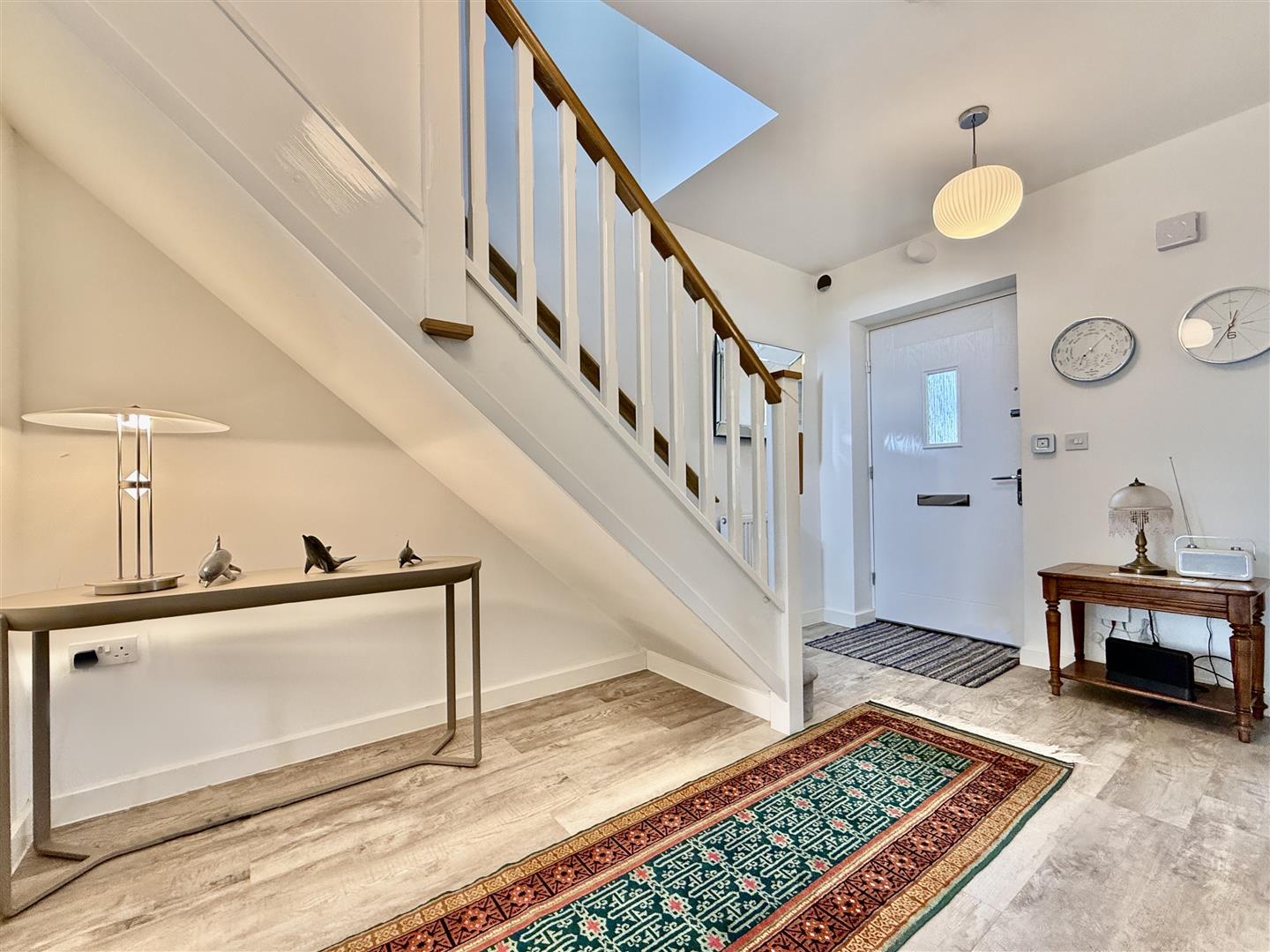 Inside, a spacious entrance hall sets the tone, leading to a generous lounge and an impressive kitchen/dining room where bi-folding doors seamlessly connect the home to the rear garden. The kitchen is fitted with high-quality integrated appliances and stylish contemporary cabinetry, creating a space that is both practical and perfect for entertaining. A ground floor study provides a versatile space for home working or exercise, while a cloakroom completes the downstairs accommodation. Throughout the ground floor, quality finishes such as Amtico flooring add a refined touch.