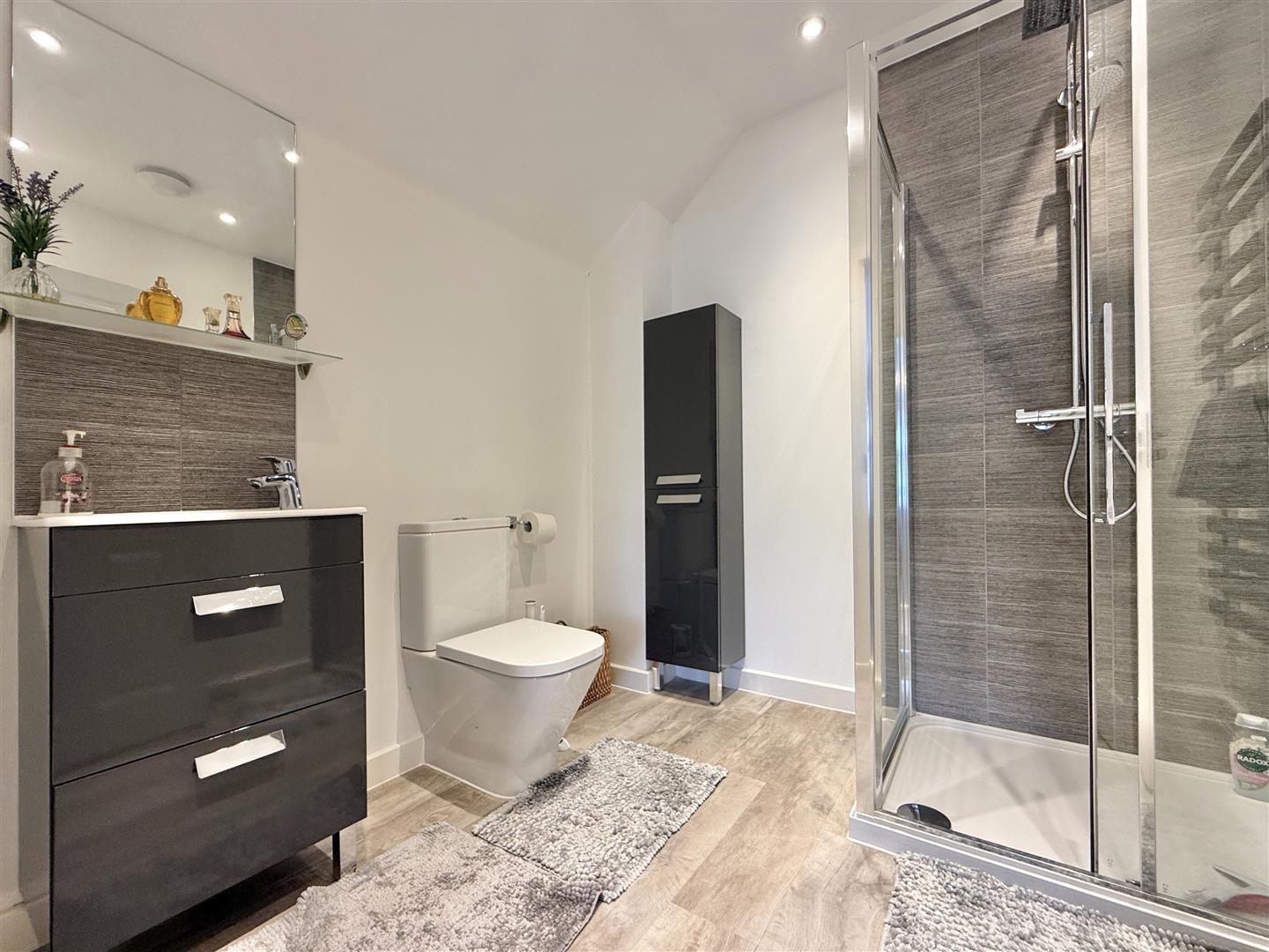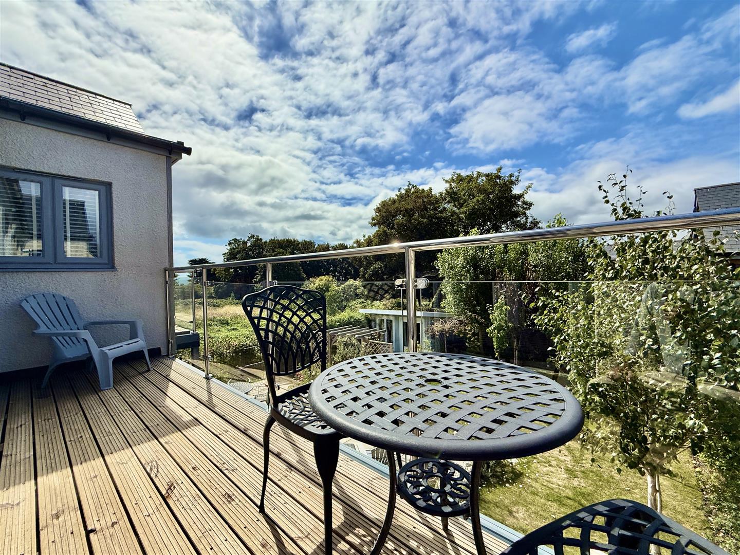 Upstairs, the light-filled landing opens to one of three balconies that take advantage of the property's elevated position. All three bedrooms are good-sized doubles with built-in storage, with the principal suite enjoying a Juliet balcony and a stylish en-suite shower room. The second and third bedrooms each open to their own balcony, providing wonderful spots to enjoy the views. A modern family bathroom, complete with separate shower enclosure, serves the remaining bedrooms.