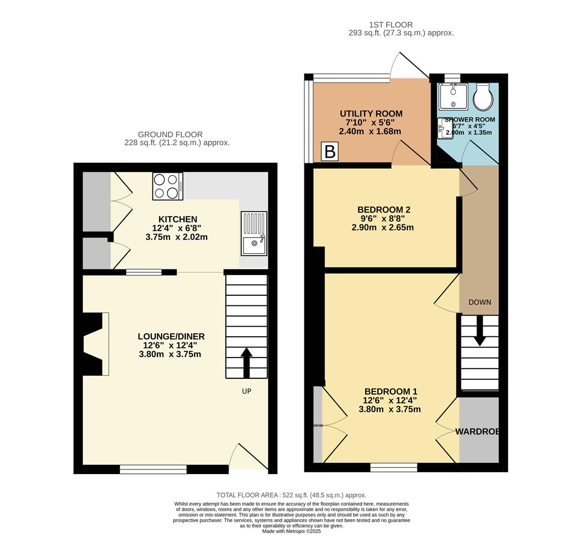 Upstairs, the spacious front bedroom features two built-in cupboards and provides a relaxing retreat, while the second bedroom at the rear is ideal as a guest room, study, or child's bedroom. A stylish modern shower room sits alongside a highly practical utility room, which houses the combi boiler and offers valuable extra storage. From here, doors lead directly out into the delightful rear garden.