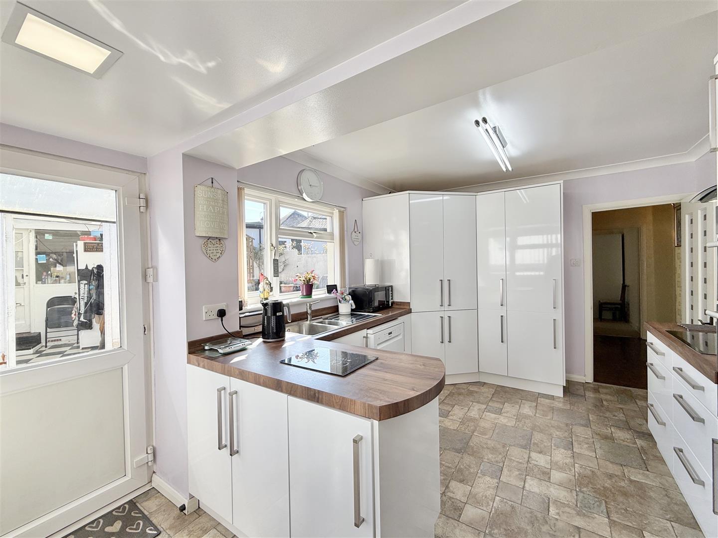 Inside, a welcoming central hallway with characterful parquet flooring sets the tone for the home. The lounge and dining area is a bright and inviting space, enhanced by a bay window, open views towards the rolling hills and a working log burner that creates a cosy focal point. The impressive kitchen sits to the rear of the property and is fitted with modern gloss units complemented by wood-effect worktops and plenty of cupboard space - offering both style and functionality, with direct access out to the garden.