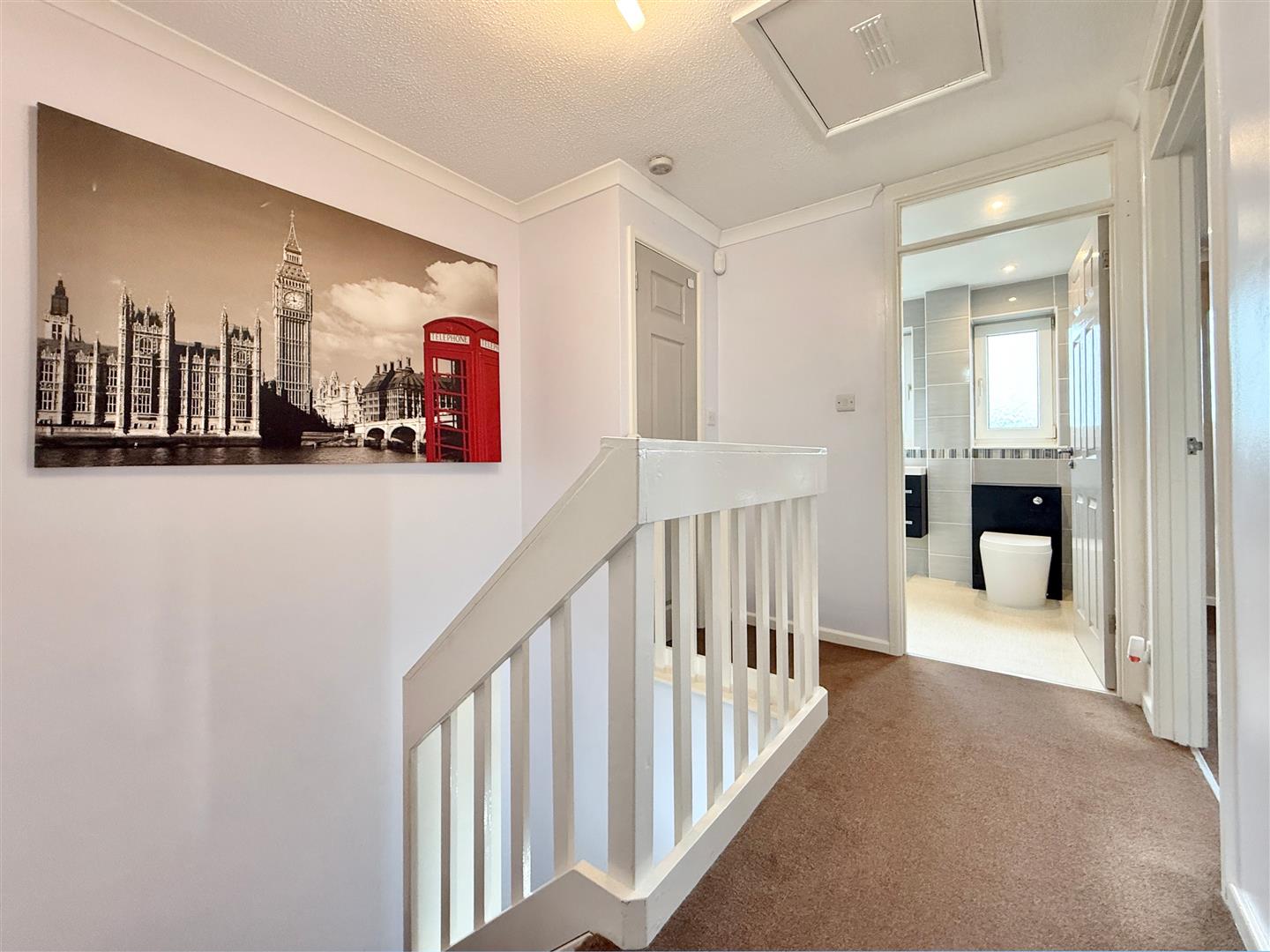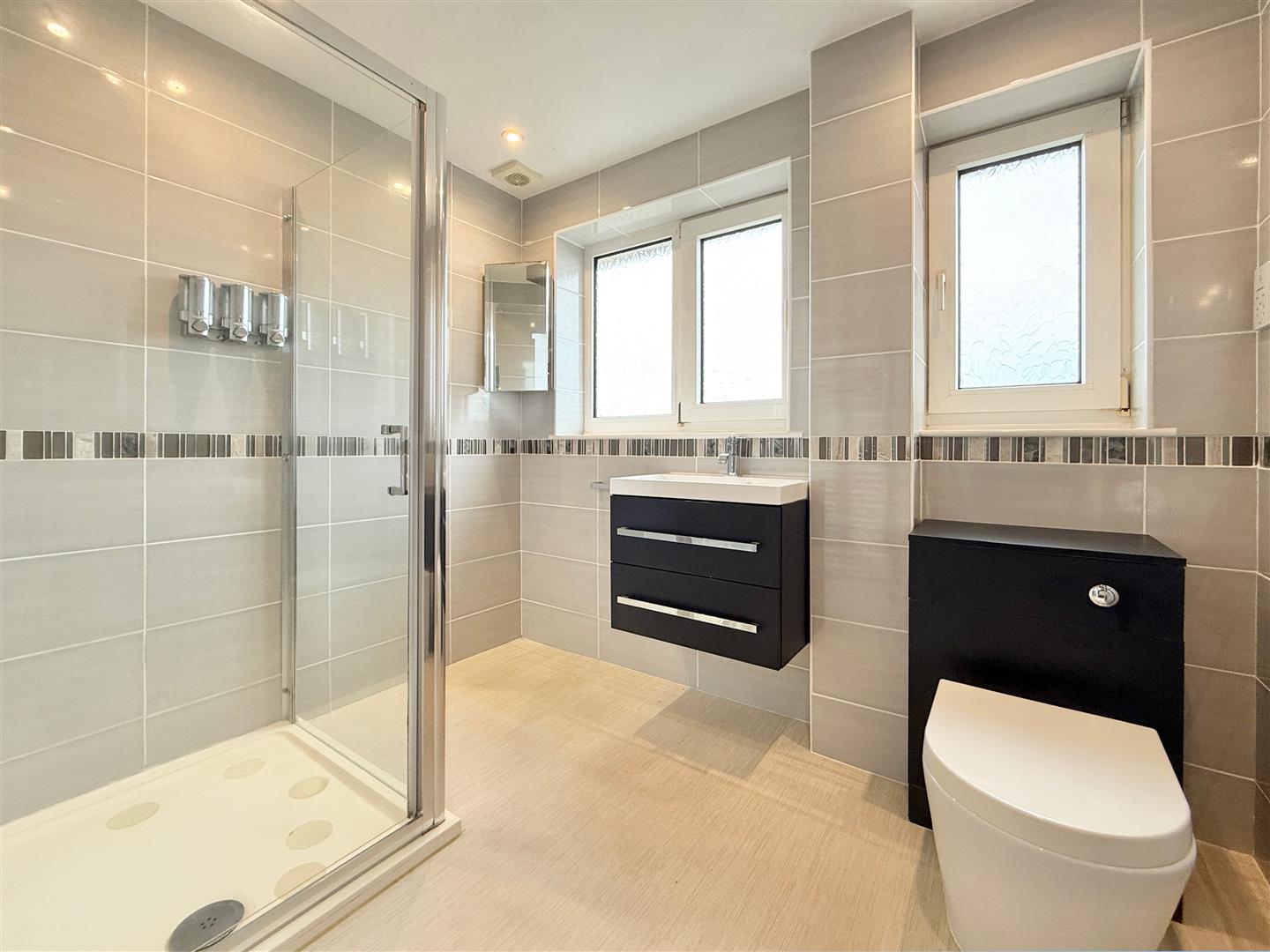 Upstairs, three well-proportioned bedrooms provide excellent flexibility, whether for a family, visiting guests, or those needing a dedicated home office. The principal and second bedrooms benefit from built-in wardrobes, enhancing storage without encroaching on floor space. The contemporary shower room, complete with a rainfall shower, adds a touch of luxury to the daily routine.