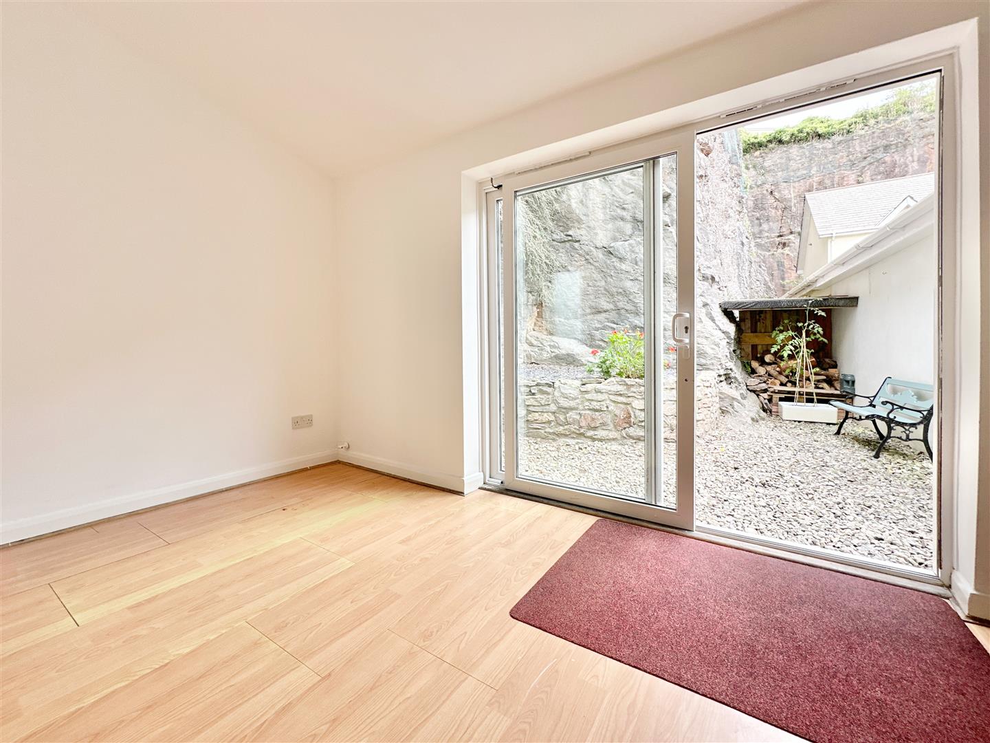 Outside, the property is set back from the road with a small frontage, ideal for bike storage or similar uses. The rear features a low-maintenance courtyard-style garden, mainly laid to gravel, backing onto a limestone rock face that provides a good degree of privacy. There is also rear access to the double garage and the parking area. The two parking spaces are generously sized, easily accommodating larger vehicles, and the double garage benefits from power and lighting.