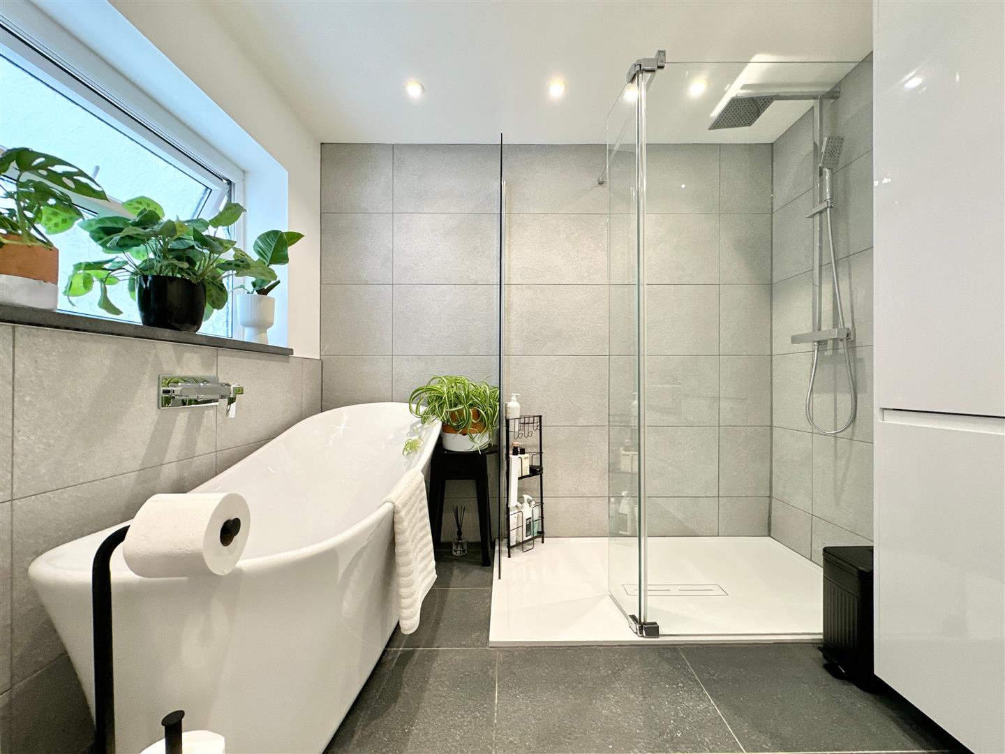 The first floor hosts a stylish, contemporary bathroom, finished with quality white sanitary ware, including a shower cubicle, freestanding bath, sink basin, and WC. A cupboard in the bathroom houses the modern combi gas central heating boiler. The property benefits from PVCu double glazing throughout.