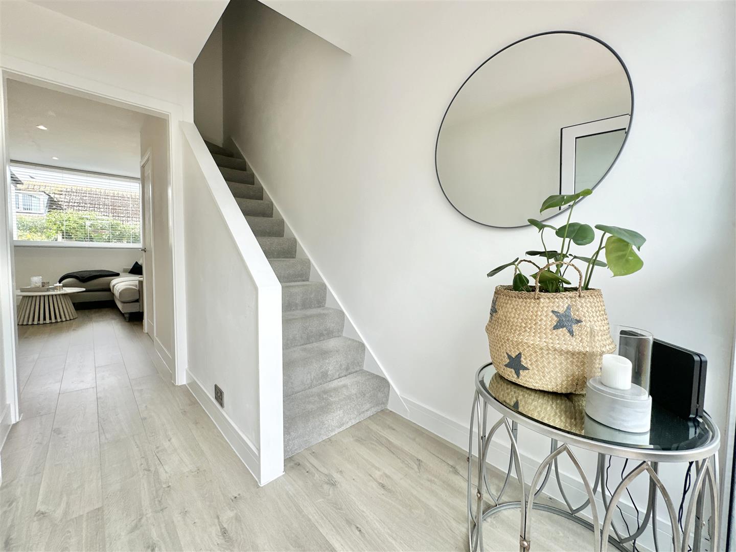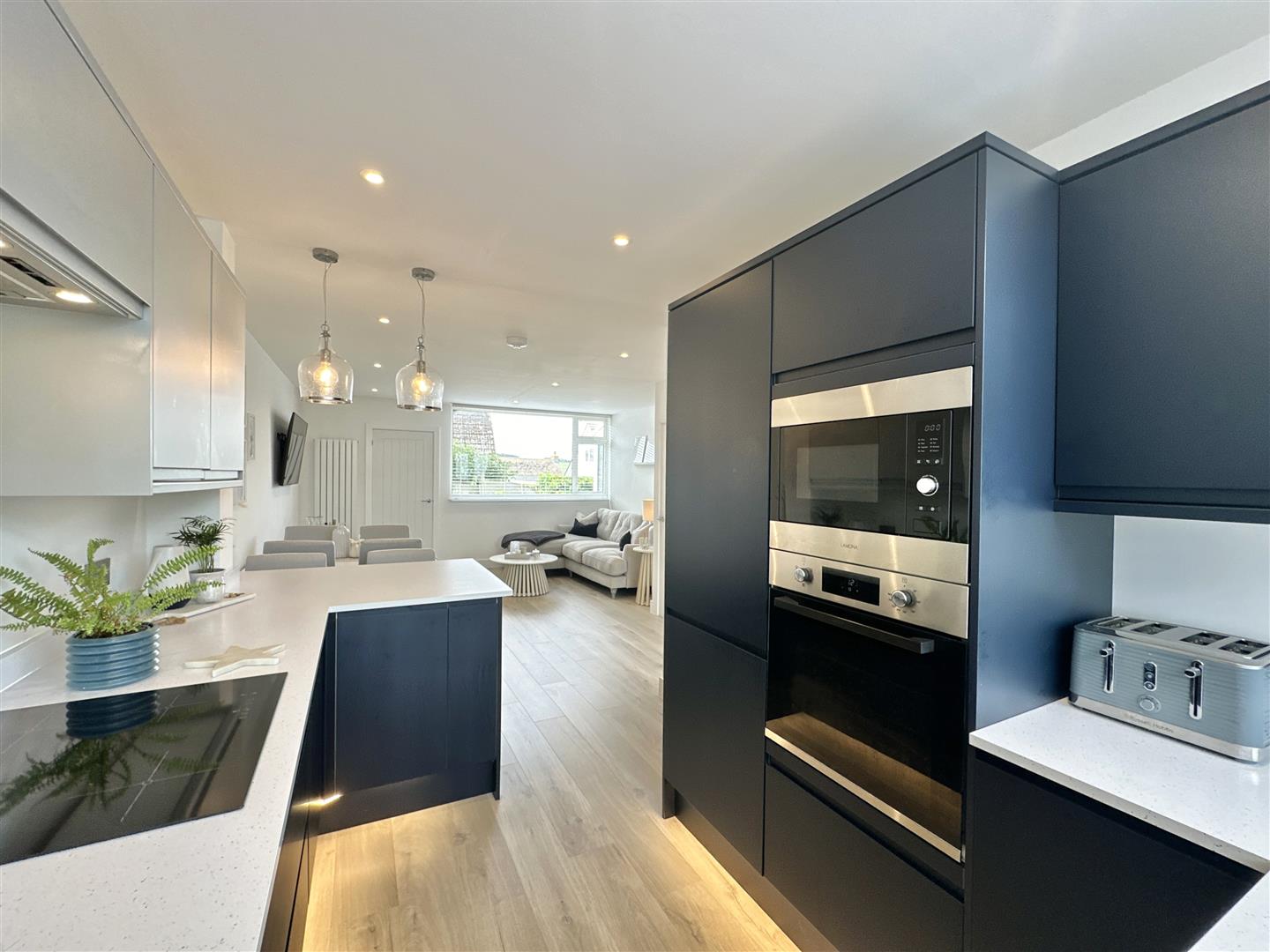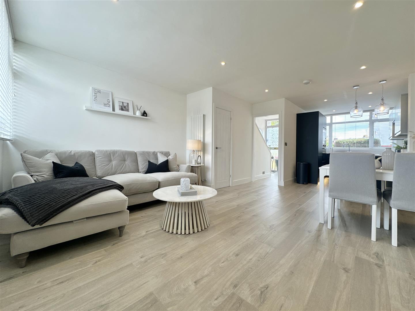 There is a pretty, low maintenance front garden which gives access to the spacious, light-and-bright entrance hall, with a good size open plan living space beyond. To the front of the ground floor there is a contemporary and high-spec kitchen with small breakfast bar separating it from the living space. Fully equipped with plenty of cupboards and worktop areas, integrated fridge freezer, mid-height oven and inset electric hob. The living space is generously sized, neutrally presented with calming tones and representing a 'blank canvas' for a new owner to add their particular style. To the rear of the ground floor there is a useful utility room with further worktop space and access out to the rear garden.