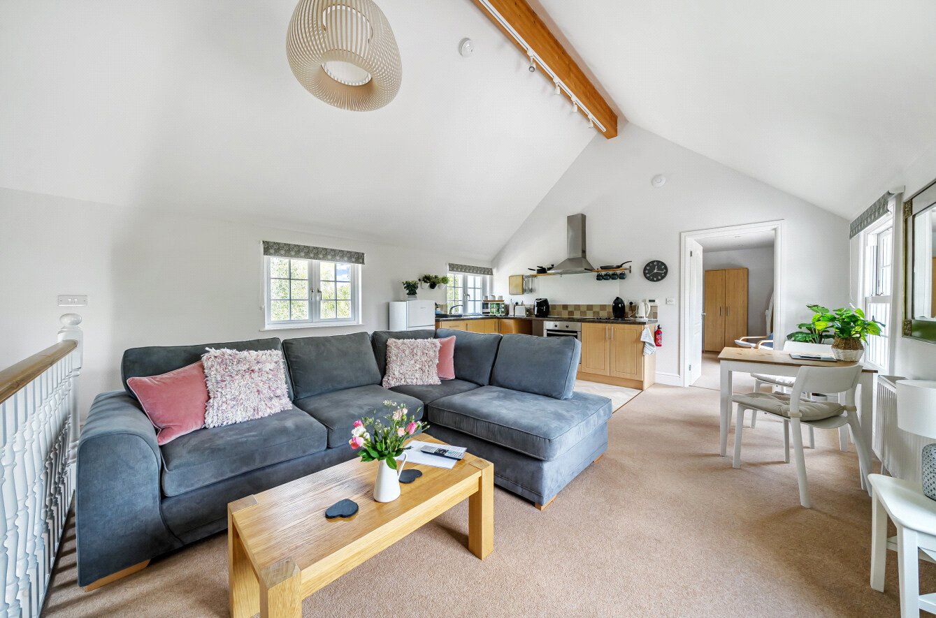 A side door gives access to the Coach House Flat ideal as an annexe for a relative or for investment/letting potential. The accommodation includes a superb triple-aspect living room/kitchen with vaulted ceiling and garden views. The kitchen area is equipped with a sink, electric oven, hob, and extractor. There is also a double bedroom and a shower room.
