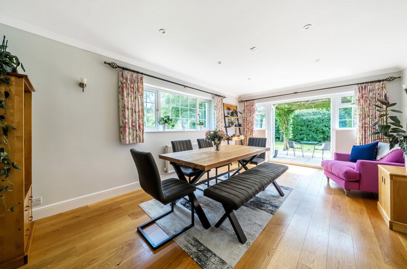 A pillared entrance porch leads into the reception hall, with stairs rising to the first floor and understairs storage. The snug features a brick fireplace with a wooden mantle, while the main reception room the 18ft sitting room is a generous space with a fitted wood burner, brick surround, and wooden mantle. A glazed door opens into the dining room, a superb dual-aspect space with views over the gardens and ample room for family dining.