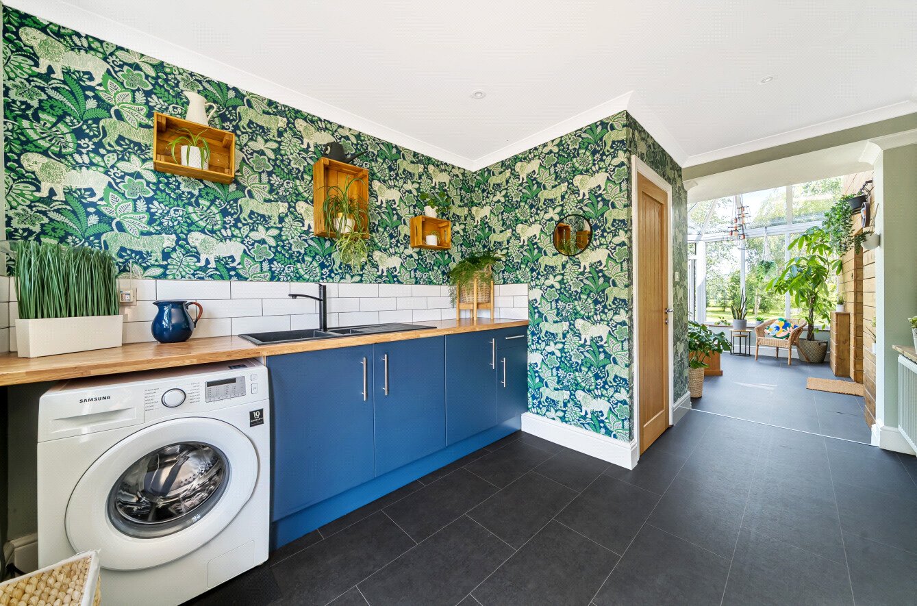 The garden room is a quality UPVC double-glazed addition with double doors opening onto the garden. This leads to the utility room, which has plumbing and space for a washing machine, a sink, and a door to the front of the property. There is also a separate WC.
