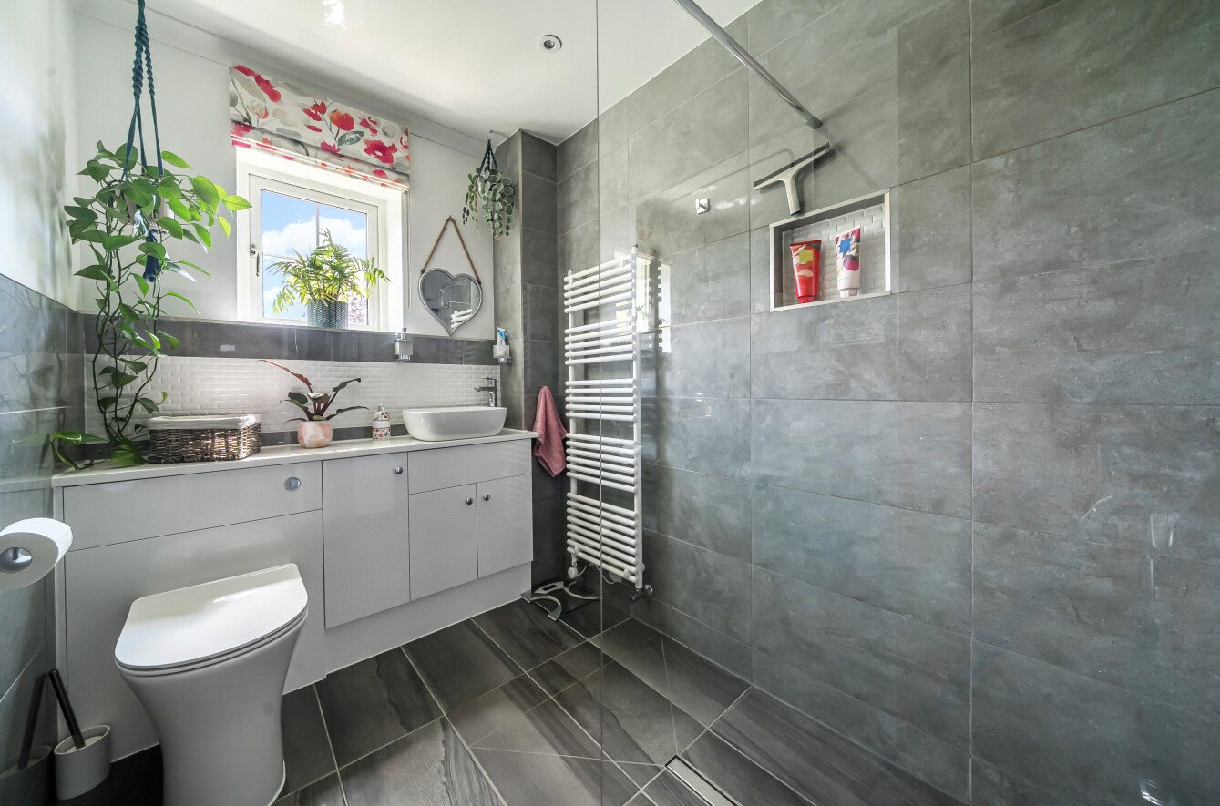 Upstairs, the first-floor landing provides access to the roof space and all five bedrooms. The principal bedroom benefits from a dressing room with a quality range of wardrobes and shelving, and an en suite shower room with a walk-in rainfall shower, WC, wash hand basin with storage below, and heated towel rail.