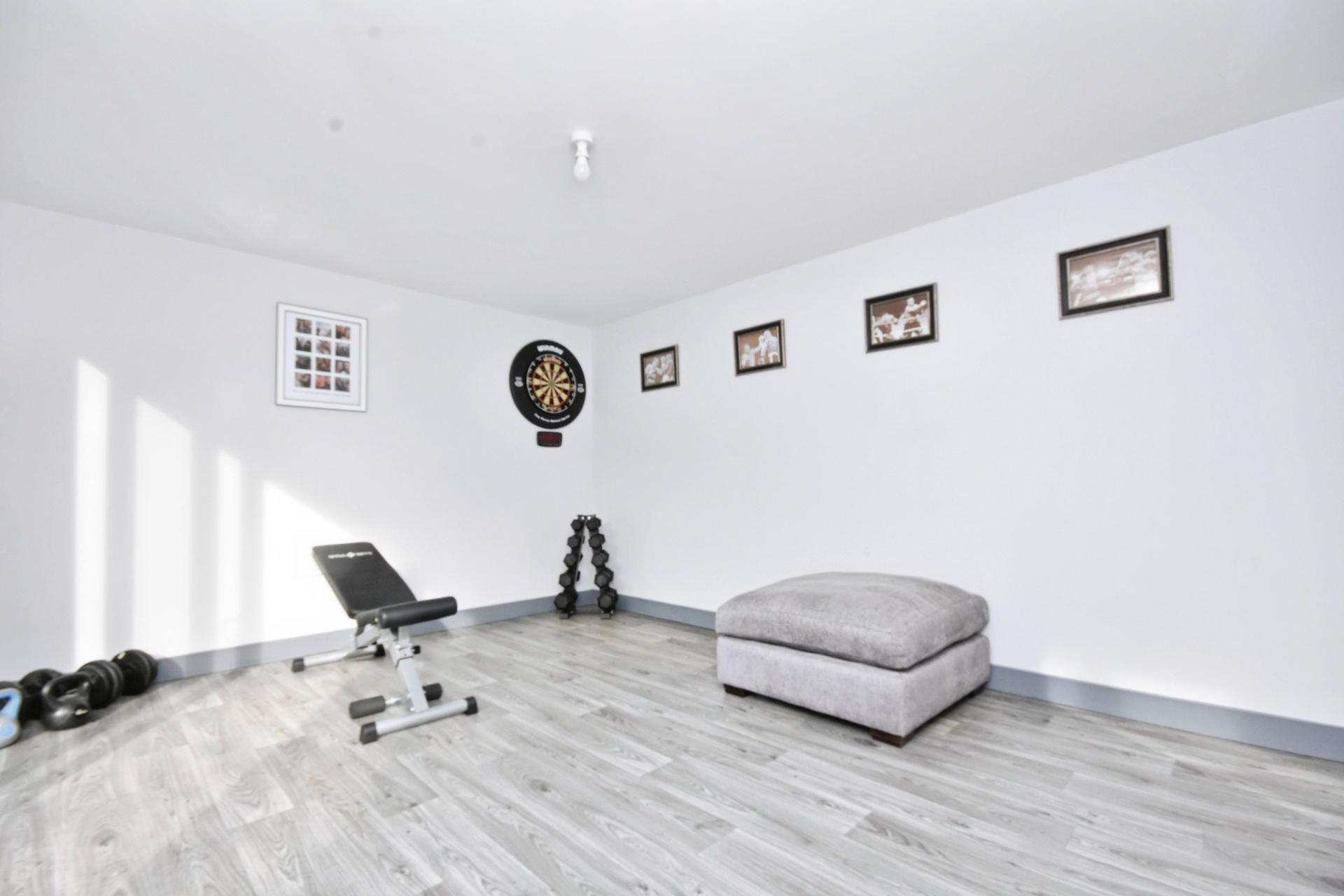 Outside, the low-maintenance garden is ideal for entertaining, with an outdoor kitchen area, shaded seating, and two composite-decked terraces. A large garden room provides space for a home gym, studio, or office. To the front, a block-paved driveway offers ample off-street parking.