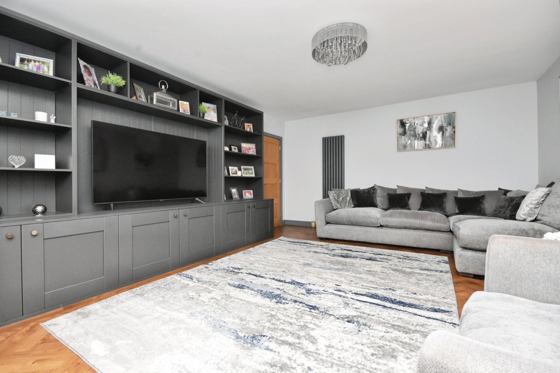 A spacious entrance hallway with elegant Amtico herringbone flooring sets the tone for the ground floor, where this premium flooring continues throughout. This level includes a cloakroom and W.C., a bright living room with a bespoke built-in media unit, and a striking open-plan kitchen/dining area. The kitchen features sleek quartz worktops, integrated Neff appliances, a Quooker hot tap, and a waste disposal unit, along with a separate utility room. Bi-fold doors open seamlessly onto the rear garden, creating the perfect space for entertaining and family living.
