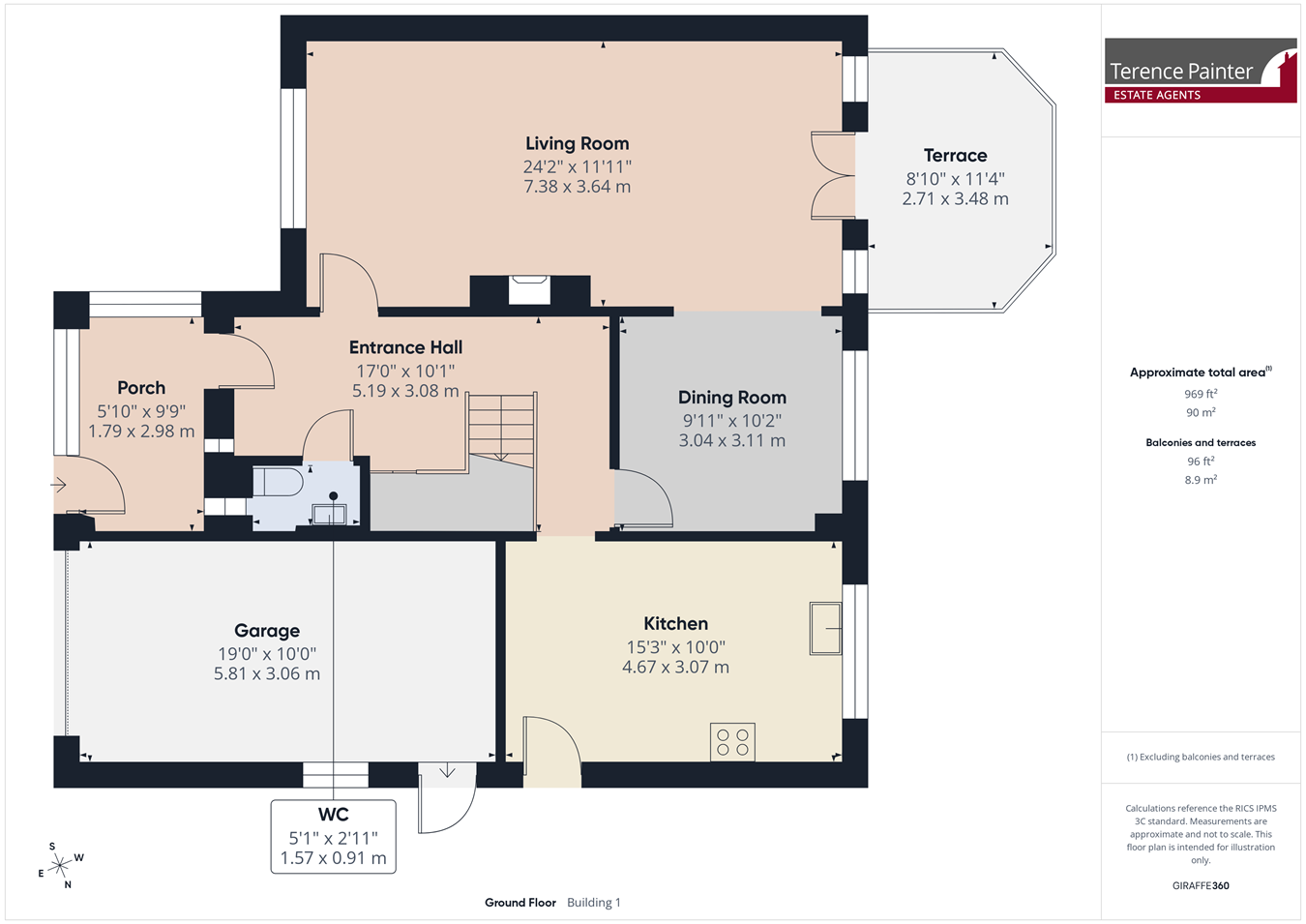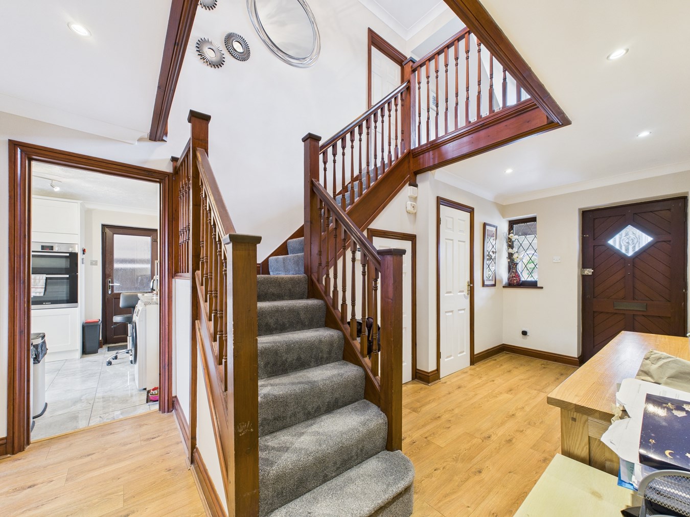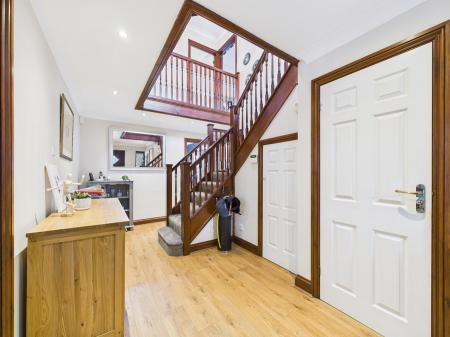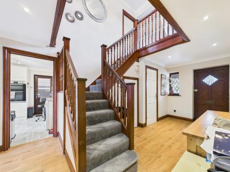 5.19m x 3.08m (17' 0" x 10' 1") The entrance hall features a double glazed window to front, understairs storage cupboard, w.c, radiator, downlights and wooden flooring.